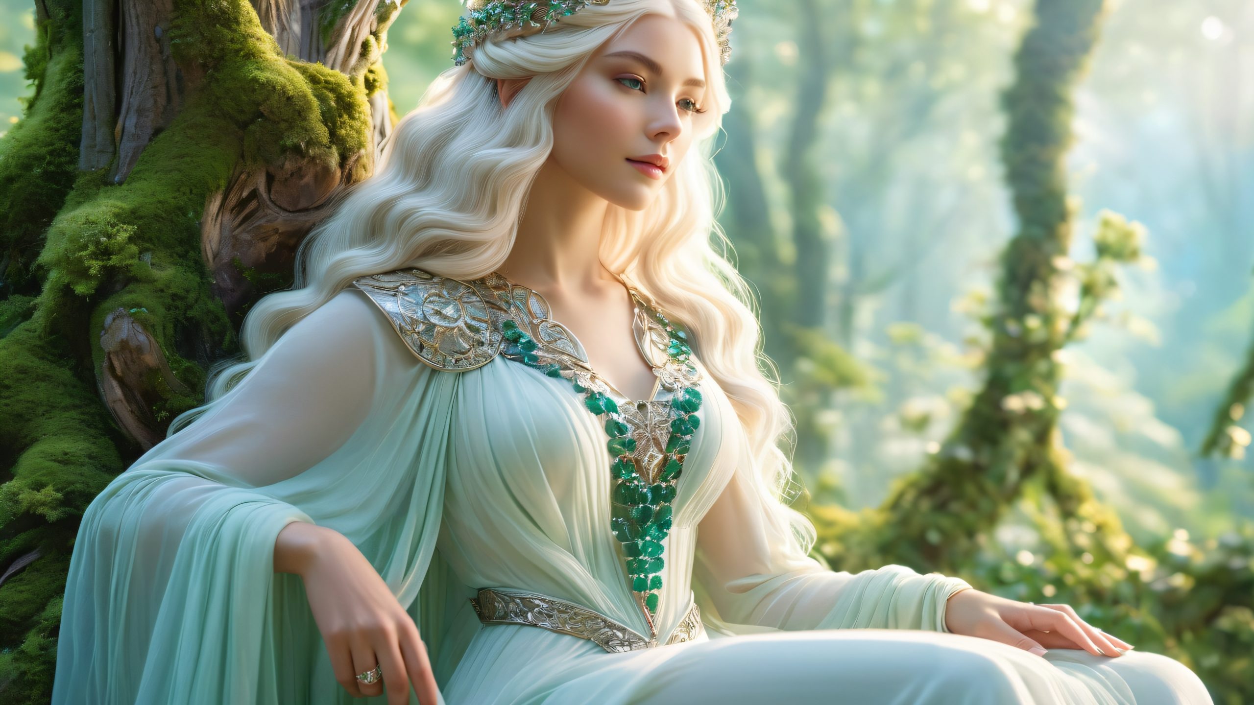 Queen Erisviel sits upon a silverwood throne, surrounded by a halo of soft light, gazing out upon a lush forest filled with ancient magic.