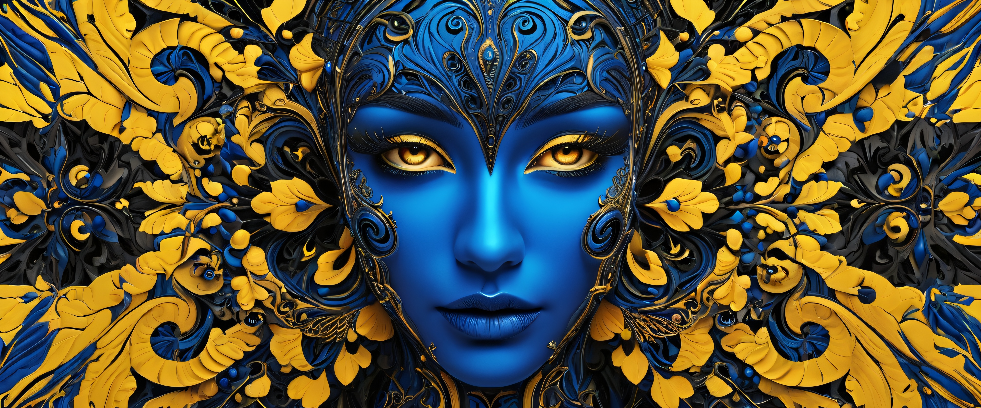Breathtaking cyberpunk wallpaper showcasing an award-winning digital art masterpiece. The image features a mesmerizing blend of organic and mechanical elements with intricate black and blue patterns. Ethereal lighting and radiant colors create a stunning visual impact, while ray-traced reflections add to the pristine clarity. This panoramic aspect ratio 21:9 ultrawide image is perfect for highlighting the facial features and industrial textures.