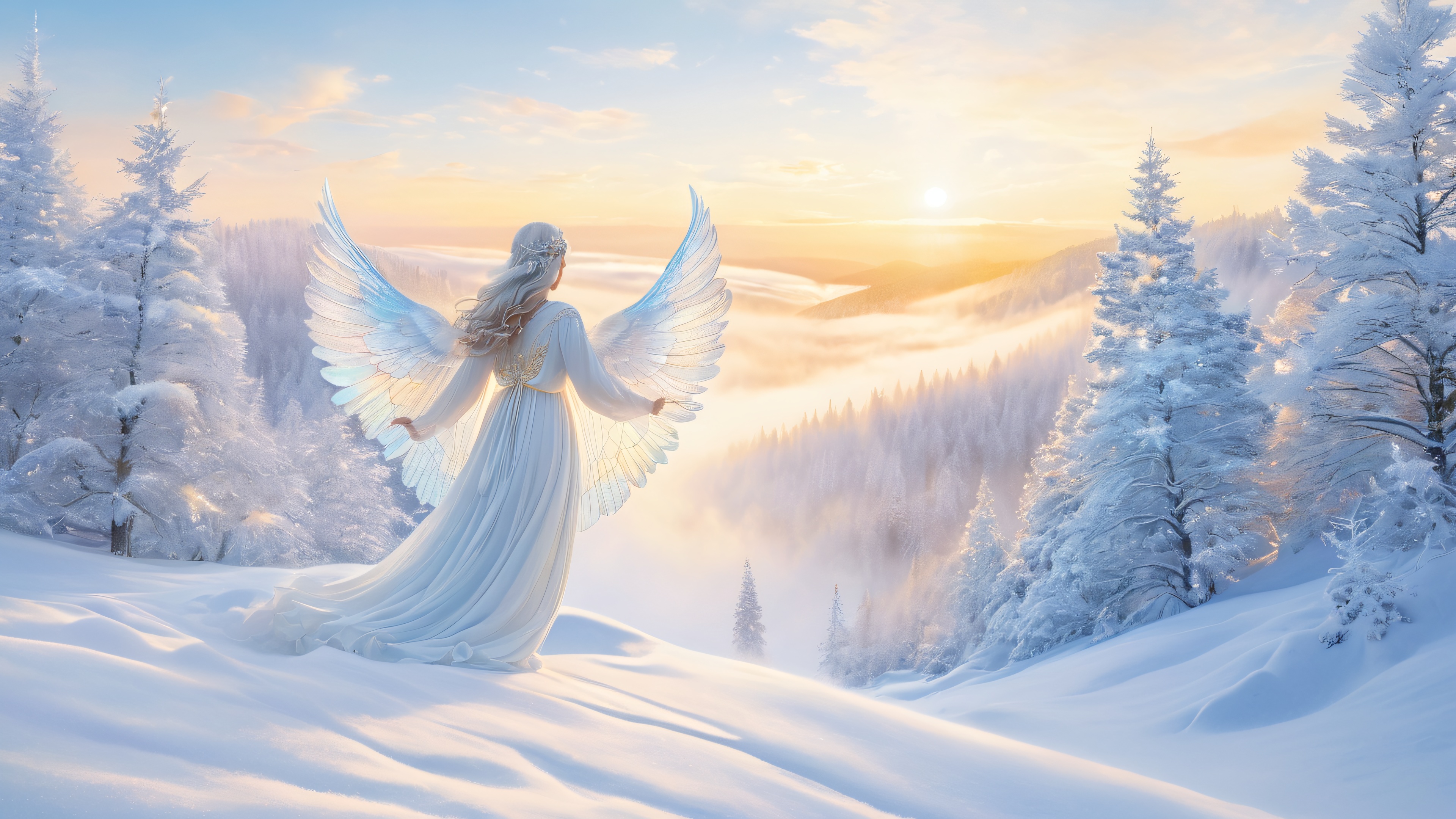 This captivating illustration features a delicate, luminescent angel gently forming a snow angel shape amidst a serene, snow-covered forest glade. The angel’s ethereal features are traced with intricate, swirling patterns that evoke the wisps of clouds. Suave, diffuse illumination from above casts a warm, golden glow on the snow-covered terrain, while the angel’s luminescent form glows with a gentle, soft light.