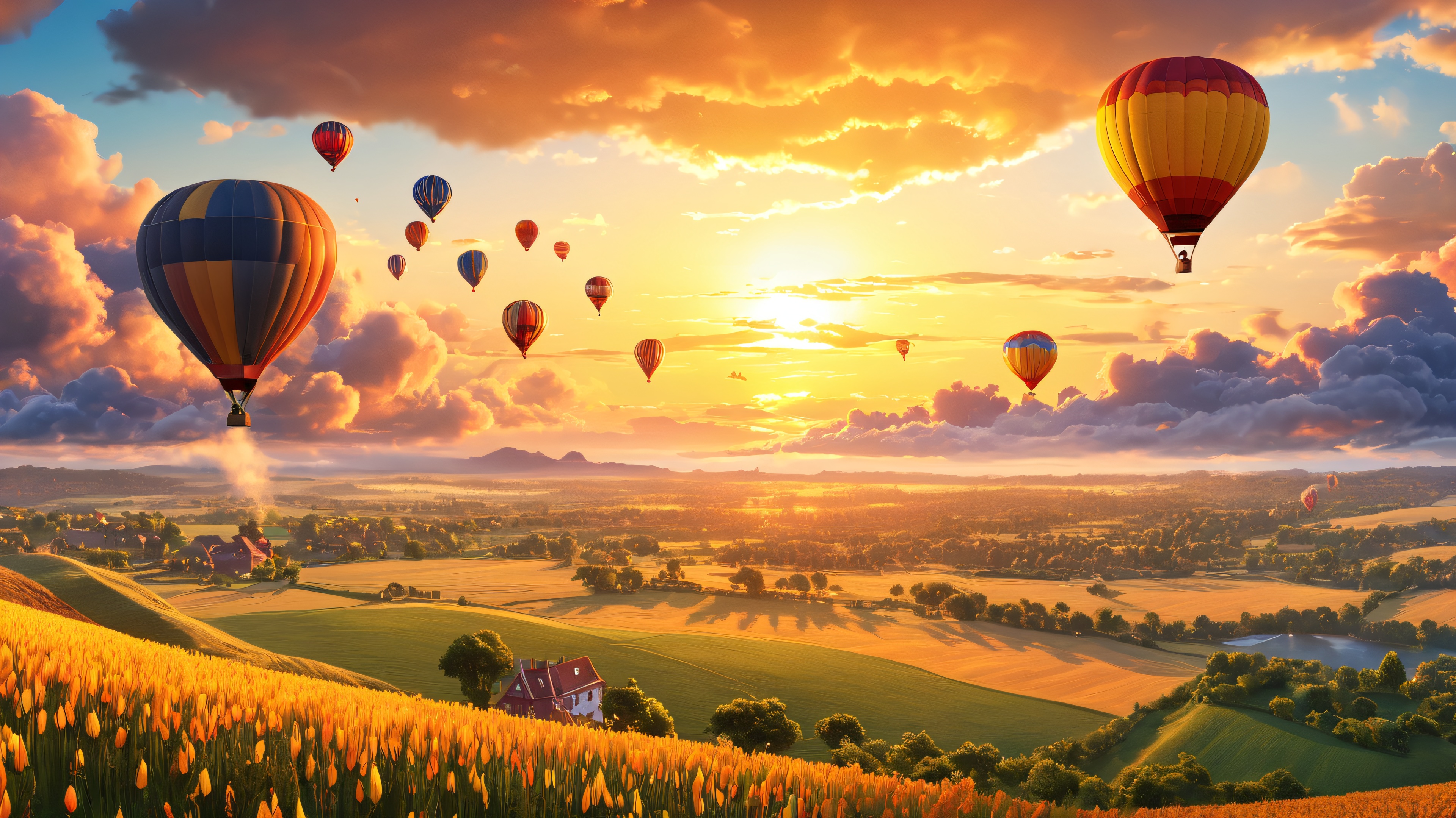 This illustration features hot air balloons rising into the sky as the sun sets behind them, casting a warm orange glow. The landscape below is dotted with fluffy white clouds, while a hint of stormy weather lingers on the horizon.
