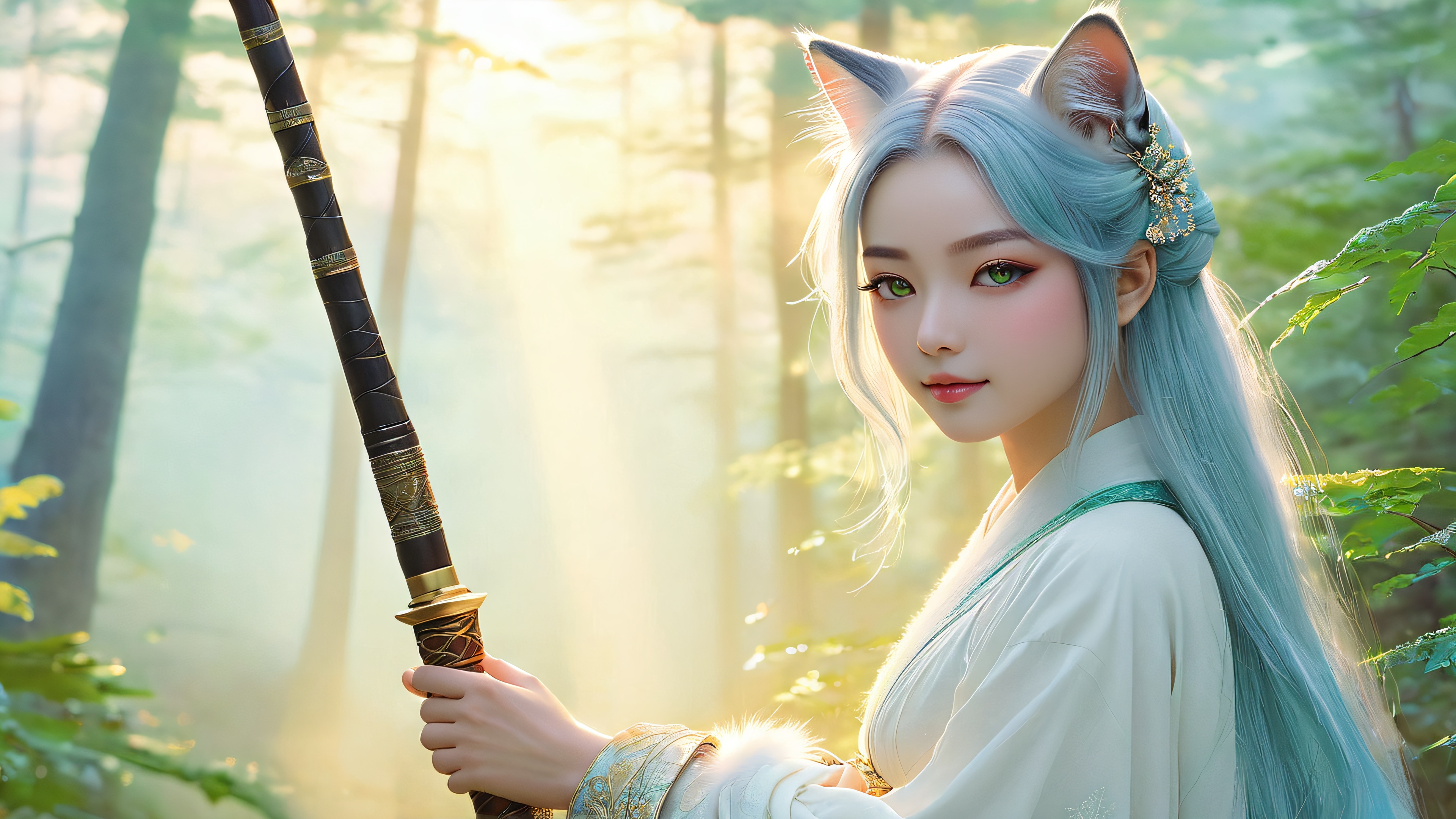 This breathtaking illustration features Mashiro Neneko, a mystical being with iridescent fur and emerald eyes, surrounded by a serene forest. Suave, gentle illumination from the misty forest floor is punctuated by bursts of luminescent magic emanating from her staff. The scene is characterized by pastel hues of pale blue, mauve, and cream, accented with subtle highlights of emerald green and warm golden light.