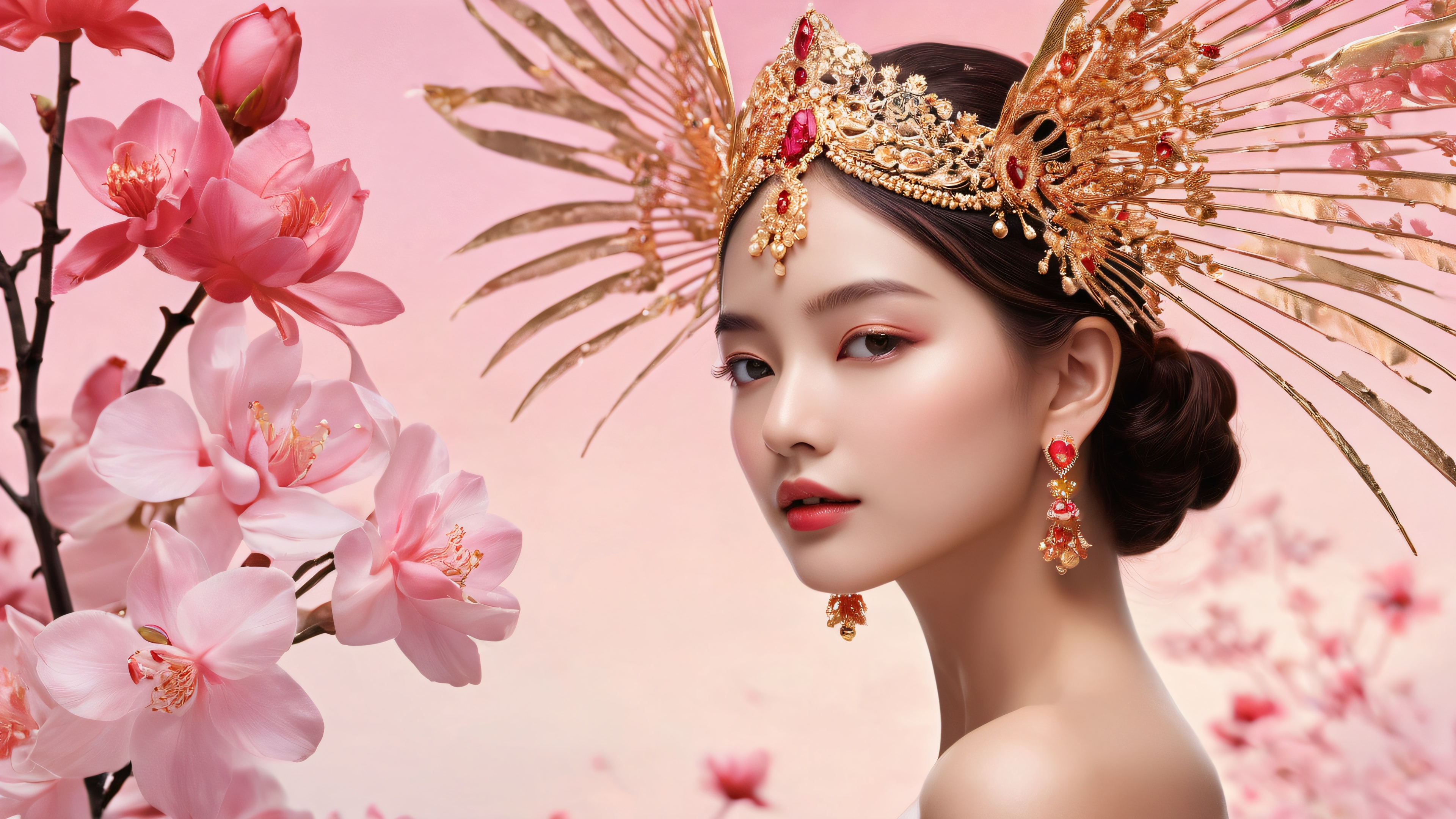 A breathtaking desktop wallpaper of women, perfectly clean vast pure void, extreme depth of field, creating an immersive atmosphere, award-winning digital art, pristine clarity, with intricate details and a focus on texture, ETHEREAL LIGHTING, Radiant, brilliant colors, ray traced reflections, and pristine clarity. Bright and airy., Vibrant pink and red hues with delicate gold accents, evoking a sense of elegance and sophistication, 16:9 aspect ratio, ethereal lighting, radiant, brilliant colors, ray traced reflections, pristine clarity, award-winning digital art, epic breathtaking scale, stunning visual impact, perfect composition, highly textured surfaces, intricate micro-details, physically based rendering, macOS wallpaper aesthetic, masterpiece, highest quality, highly detailed, 8k resolution.