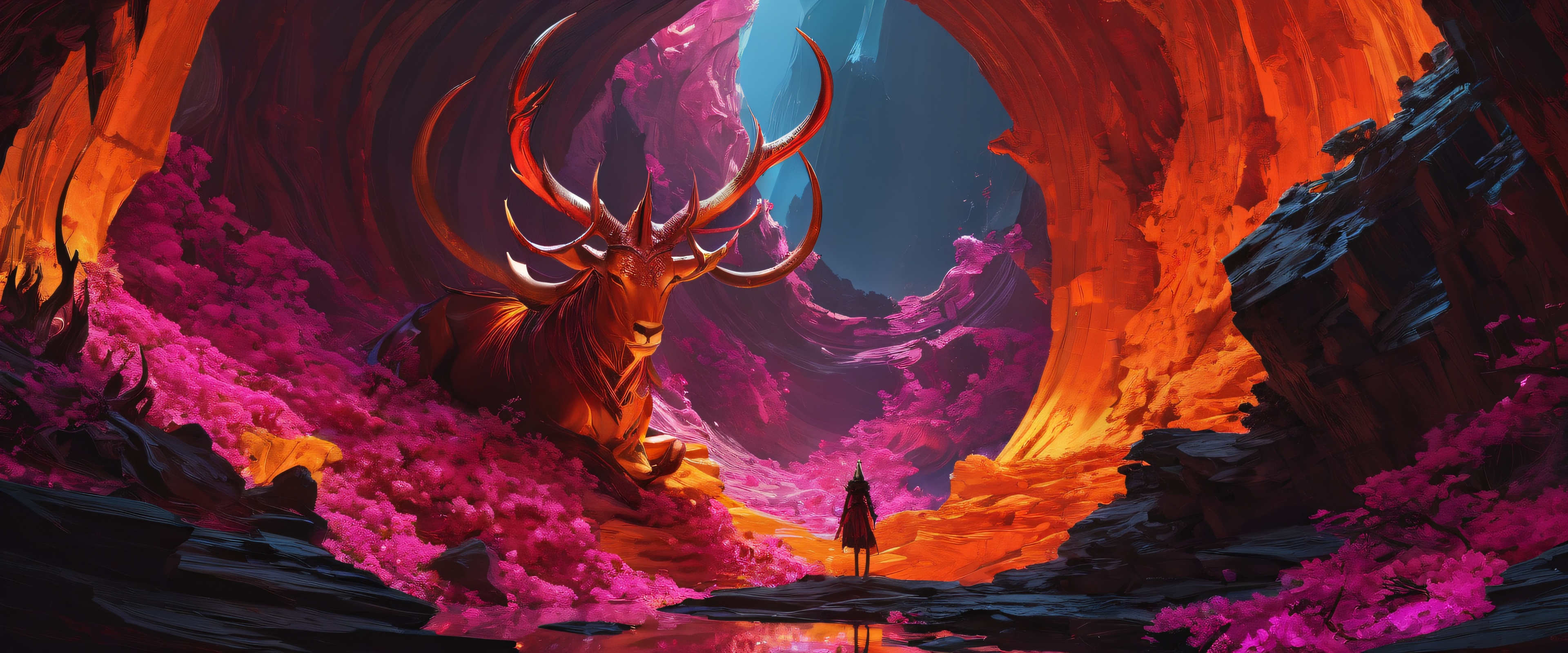 A breathtaking desktop wallpaper of Horned Queen, Perfectly clean vast pure void, extreme depth of field, apocalyptic chasm, Award-winning digital art, pristine clarity, intricate details, Ethereal lighting: Radiant brilliant colors, ray traced reflections, bright and airy with intense orange and magenta hues, [‘Deep Crimson’, ‘Fiery Orange’, ‘Magenta’, ‘Rich Black’], 21:9 ultrawide panoramic aspect ratio, epic wide shot, ethereal lighting, radiant, brilliant colors, ray traced reflections, pristine clarity, award-winning digital art, epic breathtaking scale, stunning visual impact, perfect composition, highly textured surfaces, intricate micro-details, physically based rendering, macOS wallpaper aesthetic, masterpiece, highest quality, highly detailed, 8k resolution.