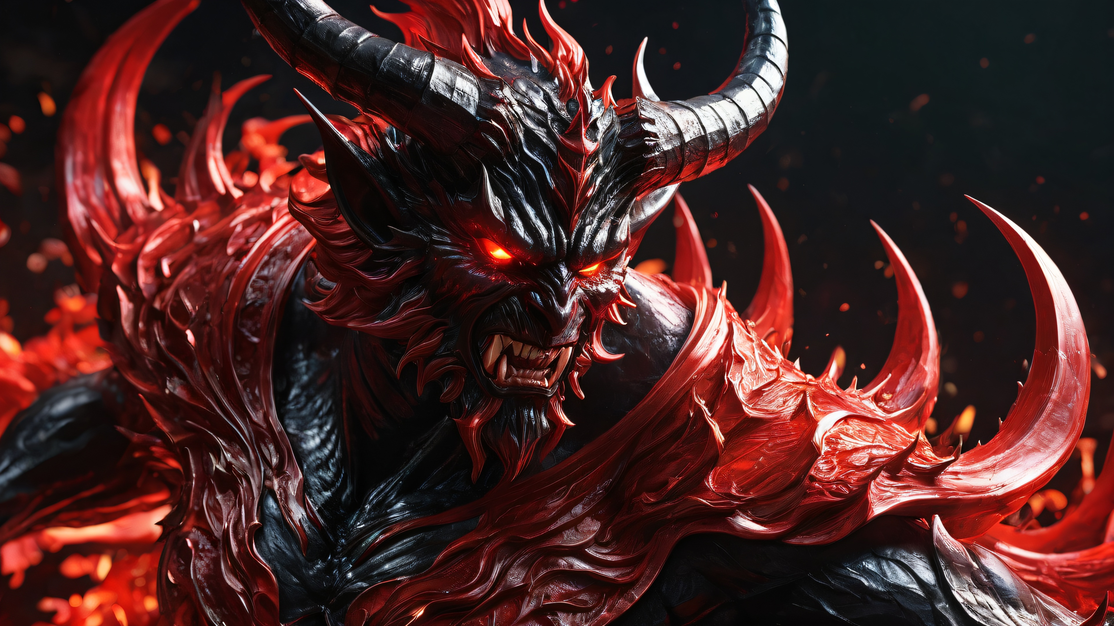 A breathtaking desktop wallpaper of Demon, Perfectly clean vast pure void, extreme depth of field, Award-winning digital art, pristine clarity, Ethereal lighting. Radiant, brilliant colors, ray traced reflections, and pristine clarity. Bright and airy., [‘Red’, ‘Black’], 16:9 aspect ratio, ethereal lighting, radiant, brilliant colors, ray traced reflections, pristine clarity, award-winning digital art, epic breathtaking scale, stunning visual impact, perfect composition, highly textured surfaces, intricate micro-details, physically based rendering, macOS wallpaper aesthetic, masterpiece, highest quality, highly detailed, 8k resolution.