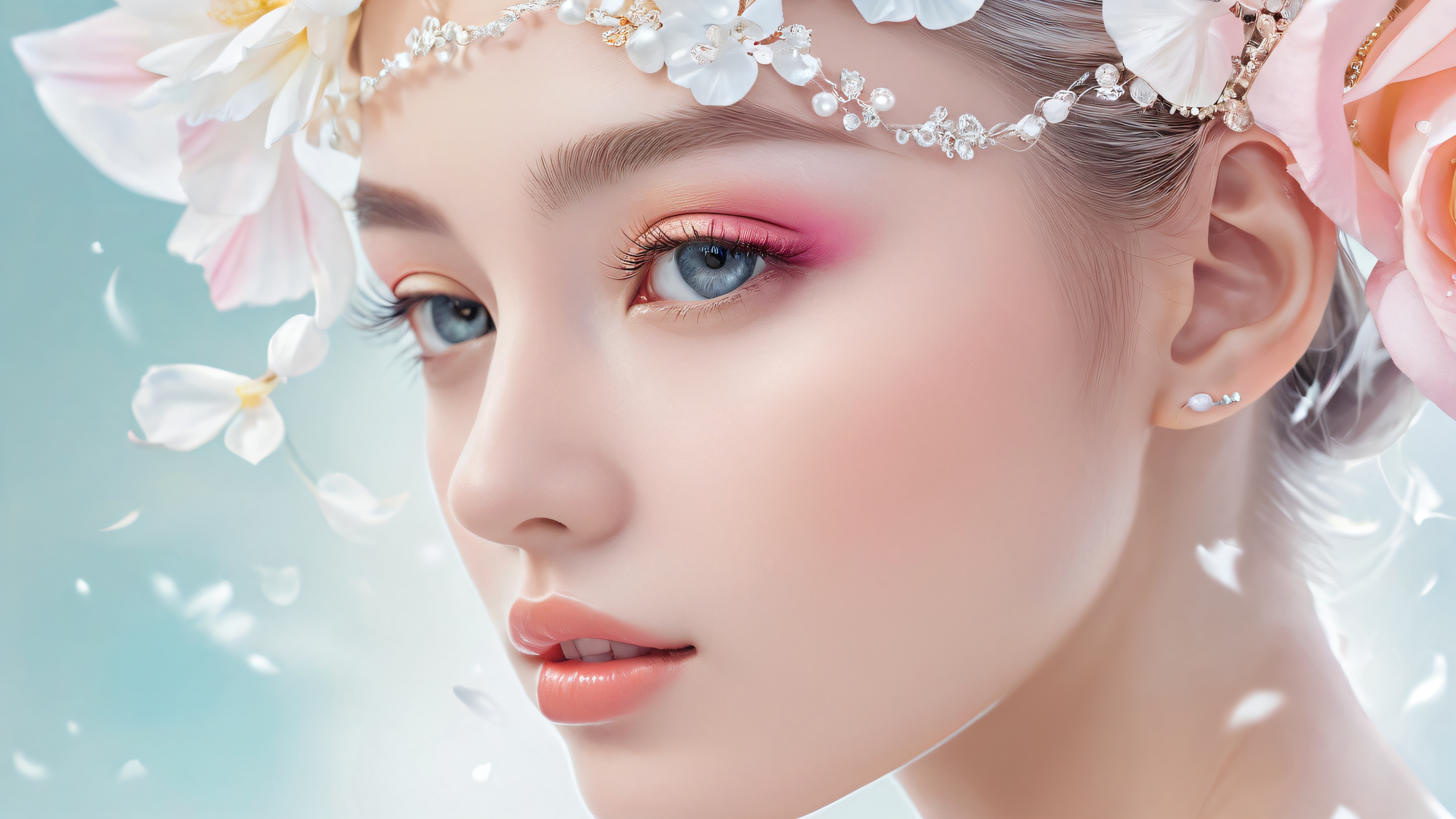 A breathtaking desktop wallpaper of Women, perfectly clean vast pure void, extreme depth of field, award-winning digital art, pristine clarity, ETHEREAL LIGHTING. Radiant, brilliant colors, ray traced reflections, and pristine clarity. Bright and airy., Dominant color palette: Pastel shades with a hint of elegance, 16:9 aspect ratio, ethereal lighting, radiant, brilliant colors, ray traced reflections, pristine clarity, award-winning digital art, epic breathtaking scale, stunning visual impact, perfect composition, highly textured surfaces, intricate micro-details, physically based rendering, macOS wallpaper aesthetic, masterpiece, highest quality, highly detailed, 8k resolution.