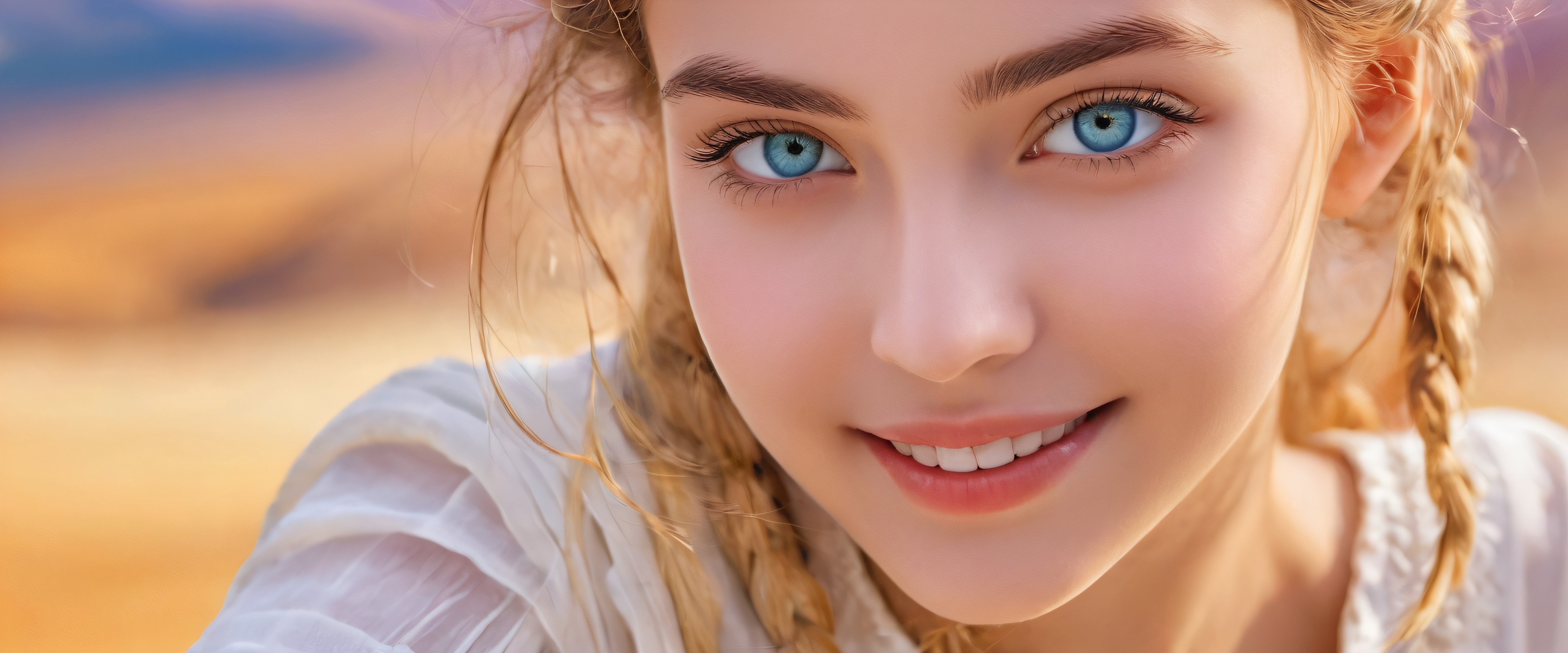 A breathtaking desktop wallpaper of Portrait, Perfectly clean vast pure void, extreme depth of field, emphasizing the subject’s beauty, Award-winning digital art, pristine clarity, stunning render of 1girl with beautiful eyes and captivating smile, Ethereal lighting, radiant brilliant colors, ray-traced reflections, and impeccable clarity, bright and airy, #F5DEB3, 21:9 ultrawide panoramic aspect ratio, epic wide shot, ethereal lighting, radiant, brilliant colors, ray traced reflections, pristine clarity, award-winning digital art, epic breathtaking scale, stunning visual impact, perfect composition, highly textured surfaces, intricate micro-details, physically based rendering, macOS wallpaper aesthetic, masterpiece, highest quality, highly detailed, 8k resolution.