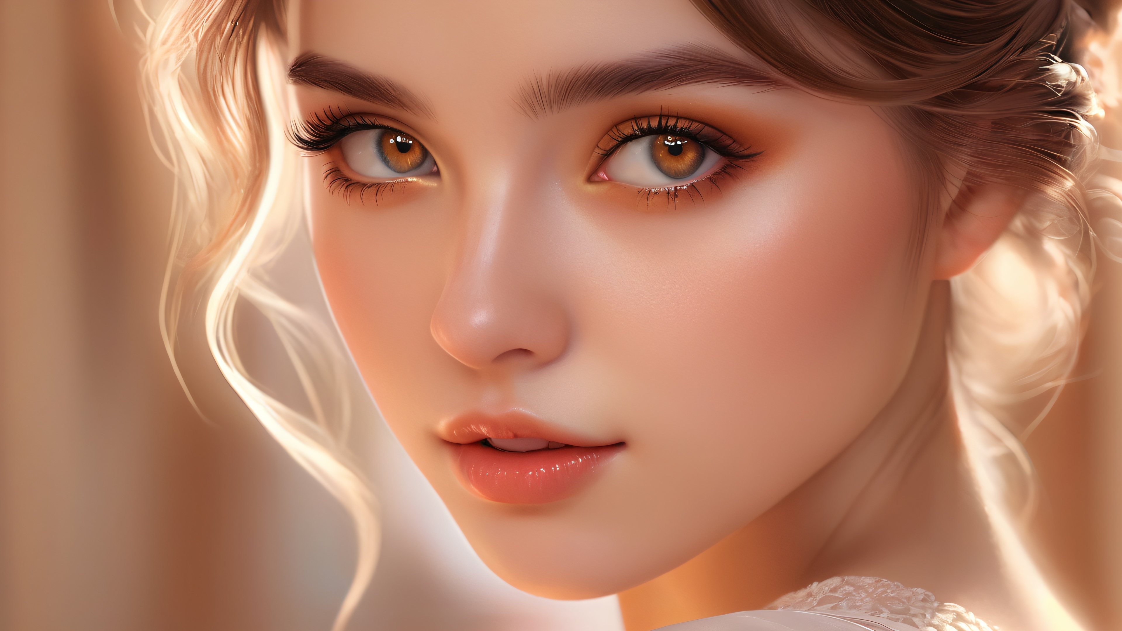 This breathtaking wallpaper features an award-winning digital art piece with a realistic portrait of a girl, showcasing intricate details and textures. The subject is set against a vast, pure void, accentuated by subtle gradient and soft focus, drawing attention to the ethereal lighting that radiates brilliant colors and ray-traced reflections. The overall aesthetic exudes a warm, gentle glow, perfect for an Apple macOS-inspired desktop wallpaper.