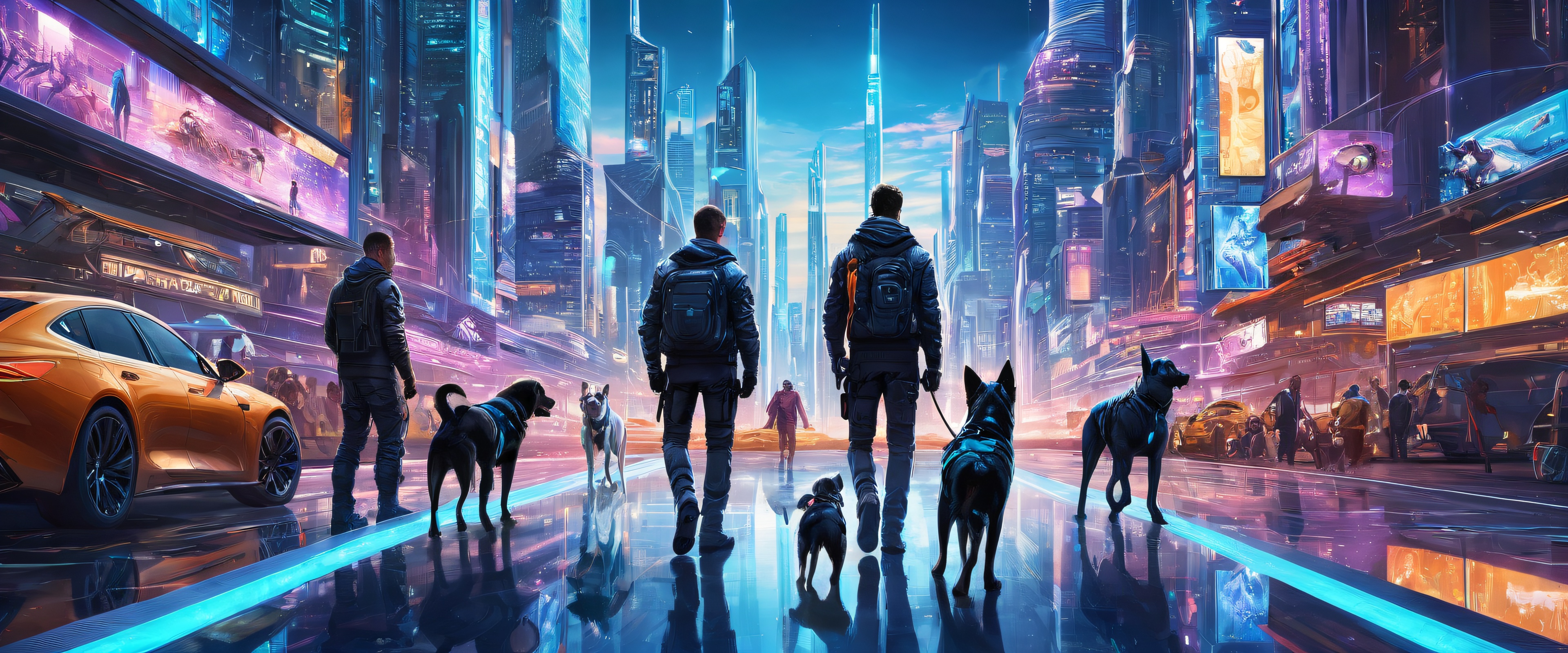 Step into an epic wide shot of a breathtakingly detailed cityscape at dusk, where the neon blues and metallic silvers of skyscrapers meet the deep charcoals of the urban landscape. The atmosphere is alive with ethereal lighting, radiant brilliant colors, and ray-traced reflections that seem to jump off the screen. A group of men and their dog stand out against this futuristic backdrop, inviting you to explore the intricate micro-details and physically based rendering that make this artwork a masterpiece.