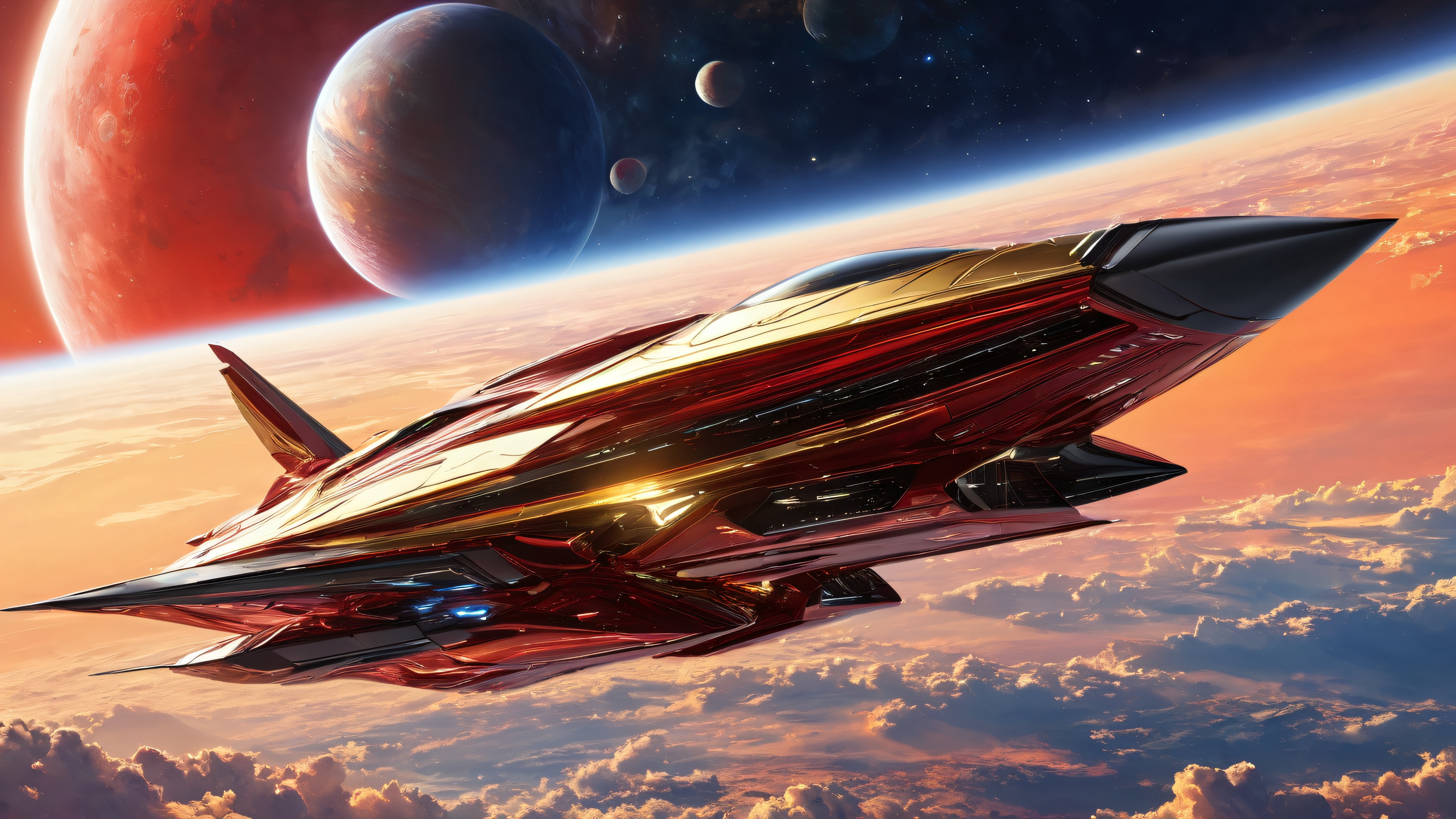 A breathtaking desktop wallpaper of Starship, perfectly clean vast pure void, extreme depth of field, award-winning digital art, pristine clarity, Ethereal lighting. Radiant, brilliant colors, ray traced reflections, and pristine clarity. Bright and airy., [‘Golden’, ‘Crimson’], 16:9 aspect ratio, ethereal lighting, radiant, brilliant colors, ray traced reflections, pristine clarity, award-winning digital art, epic breathtaking scale, stunning visual impact, perfect composition, highly textured surfaces, intricate micro-details, physically based rendering, macOS wallpaper aesthetic, masterpiece, highest quality, highly detailed, 8k resolution.