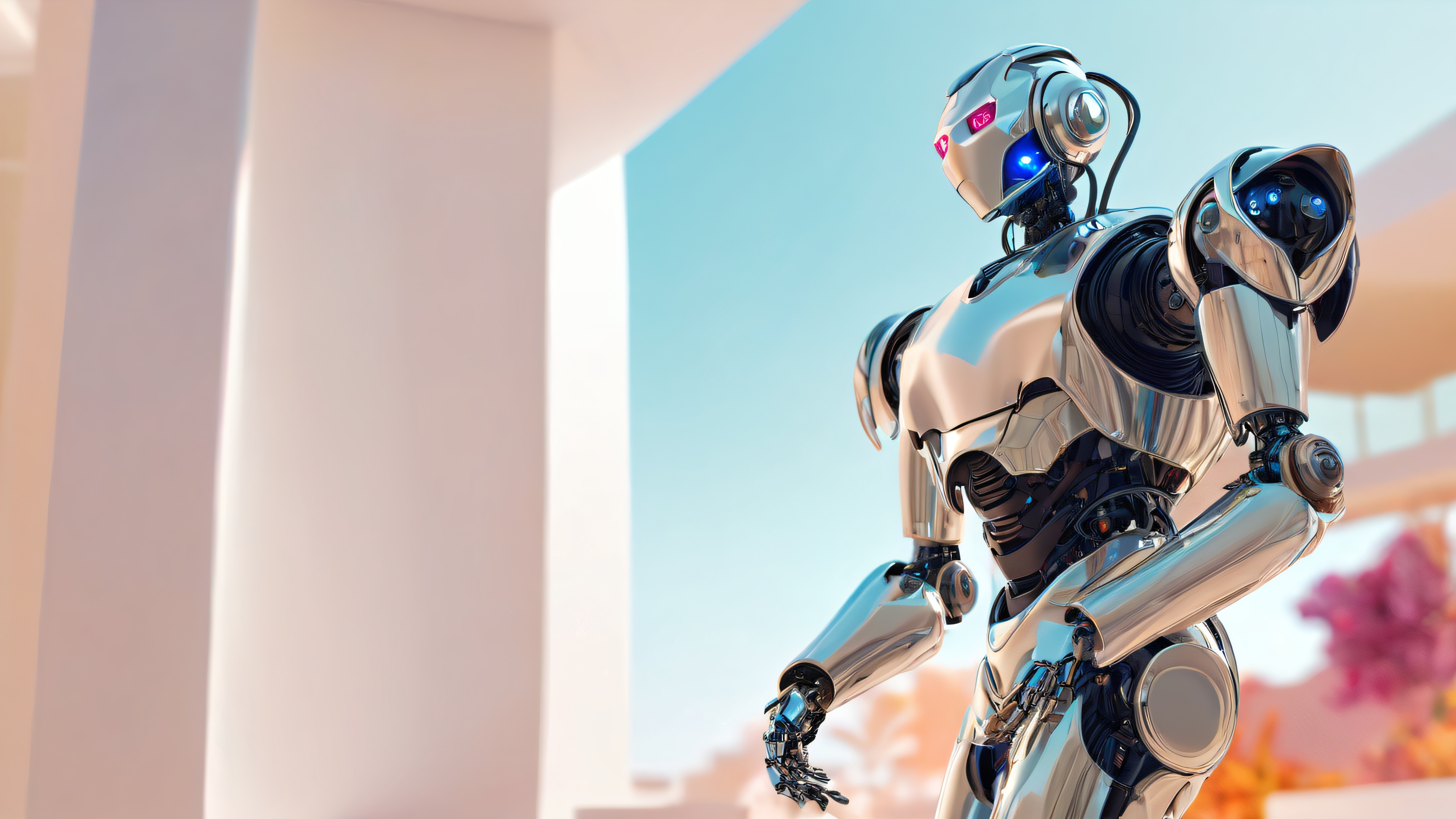 A breathtaking desktop wallpaper of Robot, Perfectly clean vast pure void, extreme depth of field, Award-winning digital art, pristine clarity, Ethereal lighting. Radiant, brilliant colors, ray traced reflections, and pristine clarity. Bright and airy., [‘#FFC080’, ‘#3498DB’], 16:9 aspect ratio, ethereal lighting, radiant, brilliant colors, ray traced reflections, pristine clarity, award-winning digital art, epic breathtaking scale, stunning visual impact, perfect composition, highly textured surfaces, intricate micro-details, physically based rendering, macOS wallpaper aesthetic, masterpiece, highest quality, highly detailed, 8k resolution.
