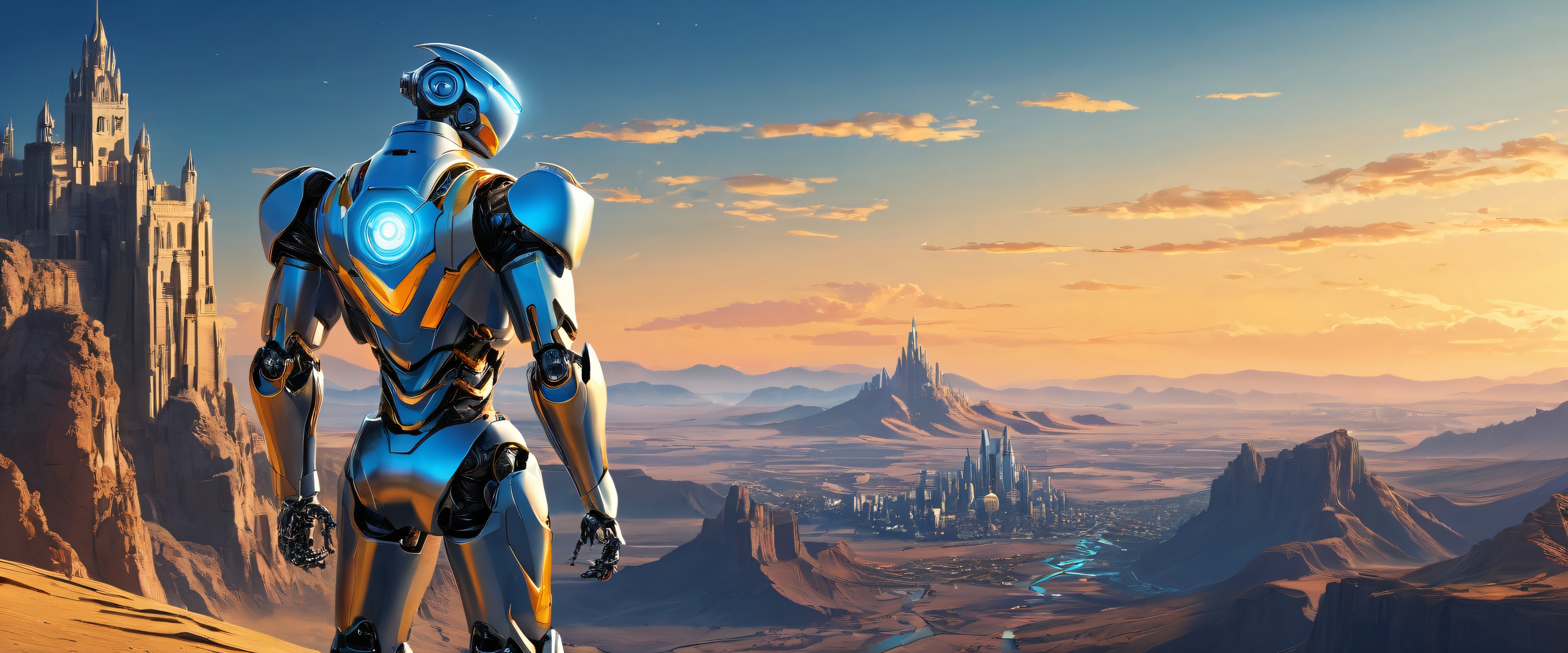 A breathtaking desktop wallpaper of Robot Hero, Perfectly clean vast pure void, extreme depth of field, with a distant landscape and towering building at dawn., Award-winning digital art, pristine clarity, featuring intricate details and dynamic action scenes., Ethereal lighting, radiant brilliant colors, ray traced reflections, and pristine clarity. Bright and airy, with subtle gradient effects to enhance the overall mood., [‘Golden’, ‘Steel Grey’, ‘Bright Blue’], 21:9 ultrawide panoramic aspect ratio, epic wide shot, ethereal lighting, radiant, brilliant colors, ray traced reflections, pristine clarity, award-winning digital art, epic breathtaking scale, stunning visual impact, perfect composition, highly textured surfaces, intricate micro-details, physically based rendering, macOS wallpaper aesthetic, masterpiece, highest quality, highly detailed, 8k resolution.