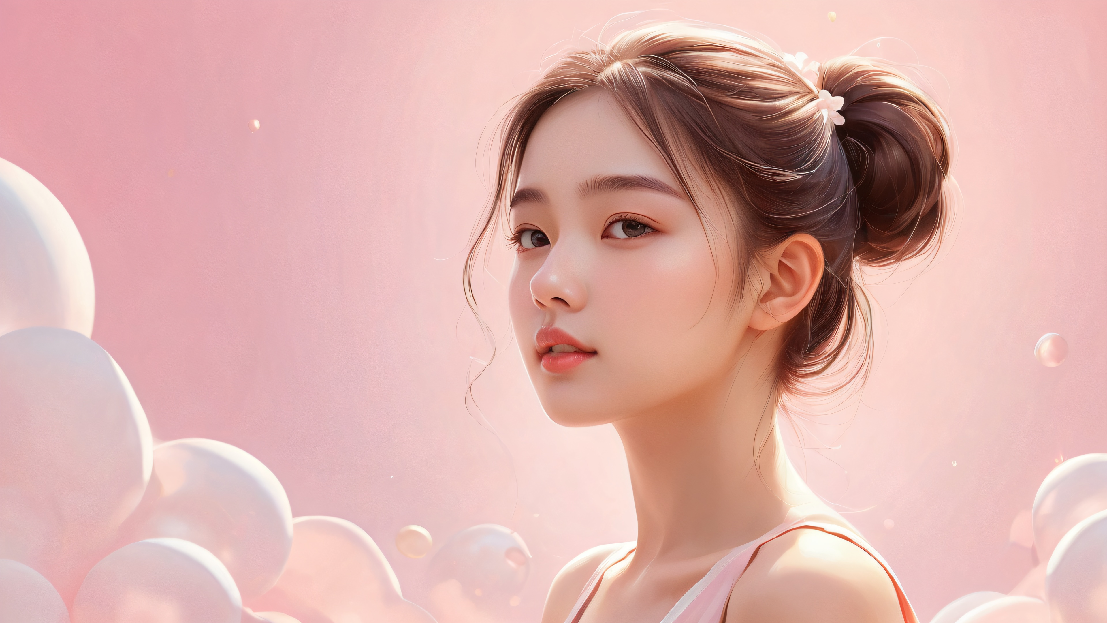 Step into this breathtakingly beautiful digital artwork, where the soft pink hue of the subject’s skin blends seamlessly with the cream and beige tones of the surrounding void. The 16:9 aspect ratio and extreme depth of field create a sense of intimacy and wonder. The ray-traced reflections and pristine clarity add a layer of sophistication, making this an award-winning piece of digital art that is sure to leave you in awe.