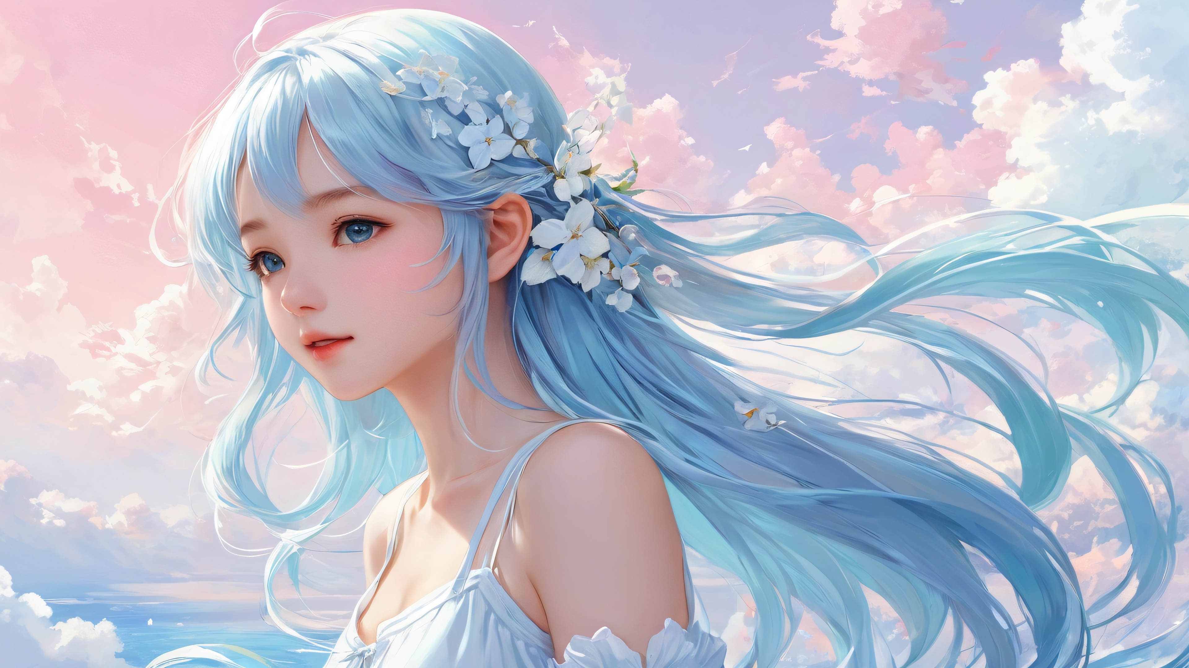 A breathtaking desktop wallpaper of Girl, Perfectly clean vast pure void, extreme depth of field, with subtle gradient effects and minimal visual noise., Award-winning digital art, pristine clarity, featuring detailed and intricate anime-inspired illustrations with a focus on texture and depth., Ethereal lighting, radiant brilliant colors, ray-traced reflections, and pristine clarity. Bright and airy, with soft luminescent highlights and gentle shading., #45B8FA (A calming blend of pastel blues and whites, reminiscent of a clear summer sky), 16:9 aspect ratio, ethereal lighting, radiant, brilliant colors, ray traced reflections, pristine clarity, award-winning digital art, epic breathtaking scale, stunning visual impact, perfect composition, highly textured surfaces, intricate micro-details, physically based rendering, macOS wallpaper aesthetic, masterpiece, highest quality, highly detailed, 8k resolution.
