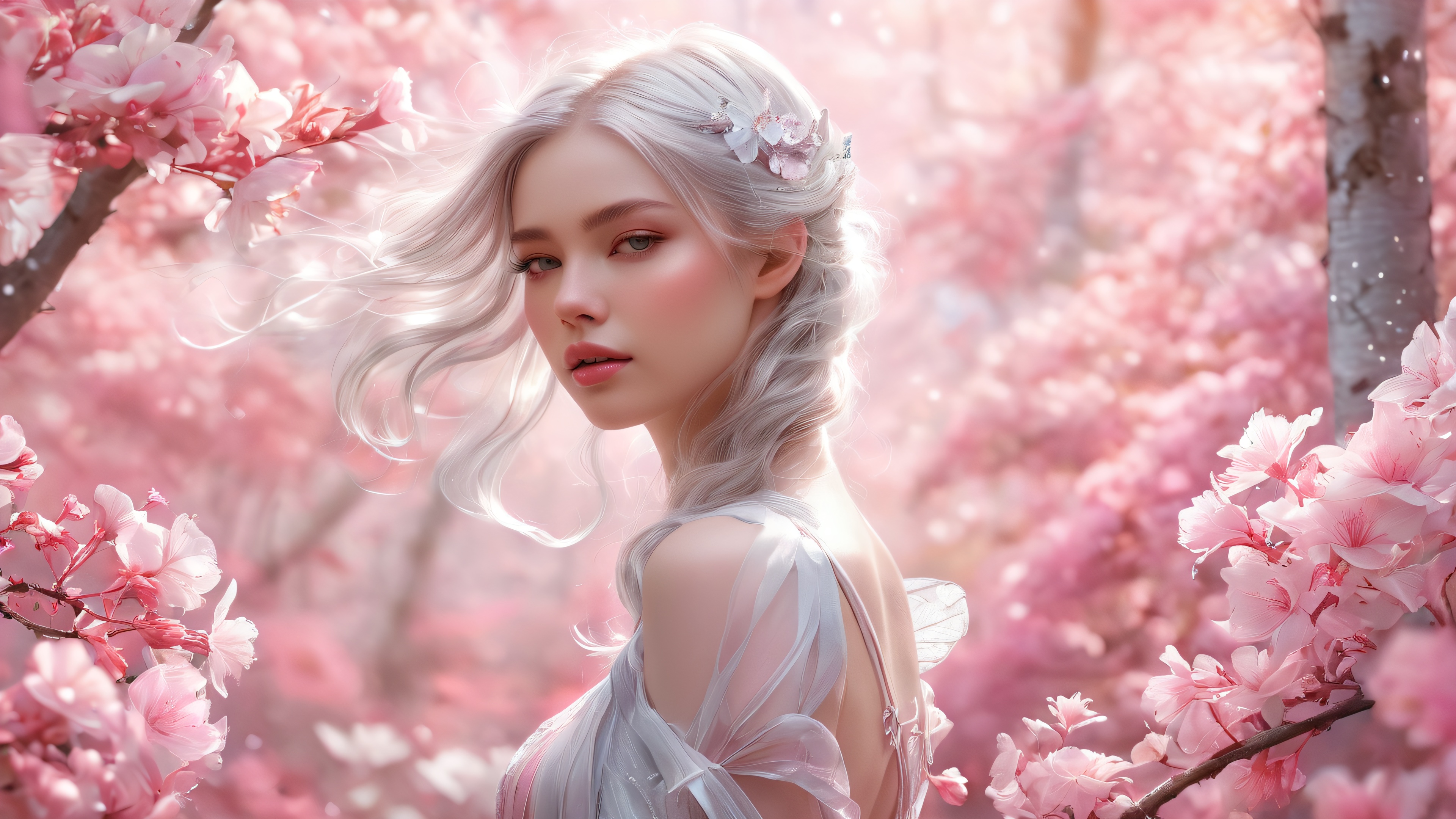 A radiant female form stands amidst a magical forest garden, surrounded by shimmering silver and pastel pink hues. Ideal for desktop or PC.