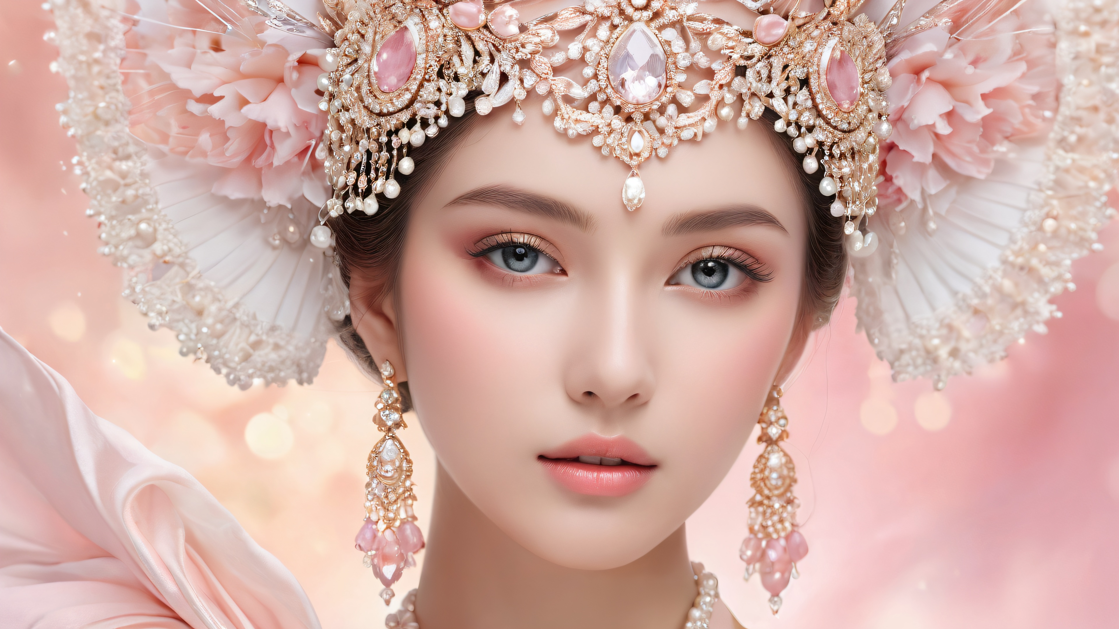 A breathtaking desktop wallpaper of Woman, Perfectly clean vast pure void with extreme depth of field, allowing the woman to take center stage., Award-winning digital art, pristine clarity, European-inspired portrait with intricate details and delicate features., Ethereal lighting with radiant brilliant colors, ray-traced reflections, and pristine clarity. Bright and airy, accentuating the subject’s features., Soft pastel hues with a focus on gentle pinks and whites, evoking a sense of elegance and sophistication., 16:9 aspect ratio, ethereal lighting, radiant, brilliant colors, ray traced reflections, pristine clarity, award-winning digital art, epic breathtaking scale, stunning visual impact, perfect composition, highly textured surfaces, intricate micro-details, physically based rendering, macOS wallpaper aesthetic, masterpiece, highest quality, highly detailed, 8k resolution.