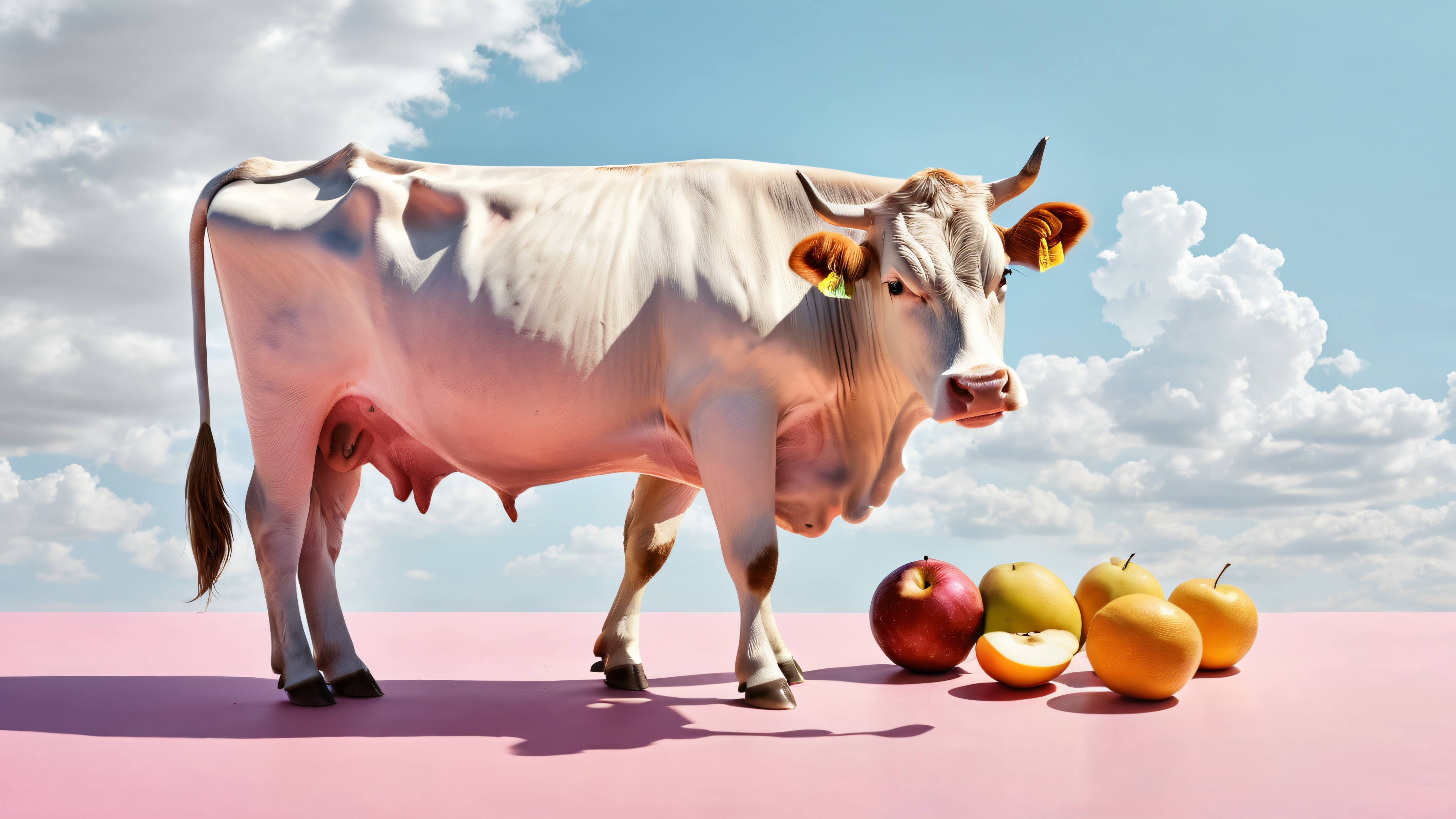 A breathtaking desktop wallpaper of {‘horizontal’: [‘Cow-sized fruit with udders getting milked by a farmer’]}, Perfectly clean vast pure void, extreme depth of field, Award-winning digital art, pristine clarity, Ethereal lighting. Radiant, brilliant colors, ray-traced reflections, and pristine clarity. Bright and airy., {‘dominant’: [‘Pastel Pink’, ‘Cream’], ‘mood’: ‘Playful’}, 16:9 aspect ratio, ethereal lighting, radiant, brilliant colors, ray traced reflections, pristine clarity, award-winning digital art, epic breathtaking scale, stunning visual impact, perfect composition, highly textured surfaces, intricate micro-details, physically based rendering, macOS wallpaper aesthetic, masterpiece, highest quality, highly detailed, 8k resolution.