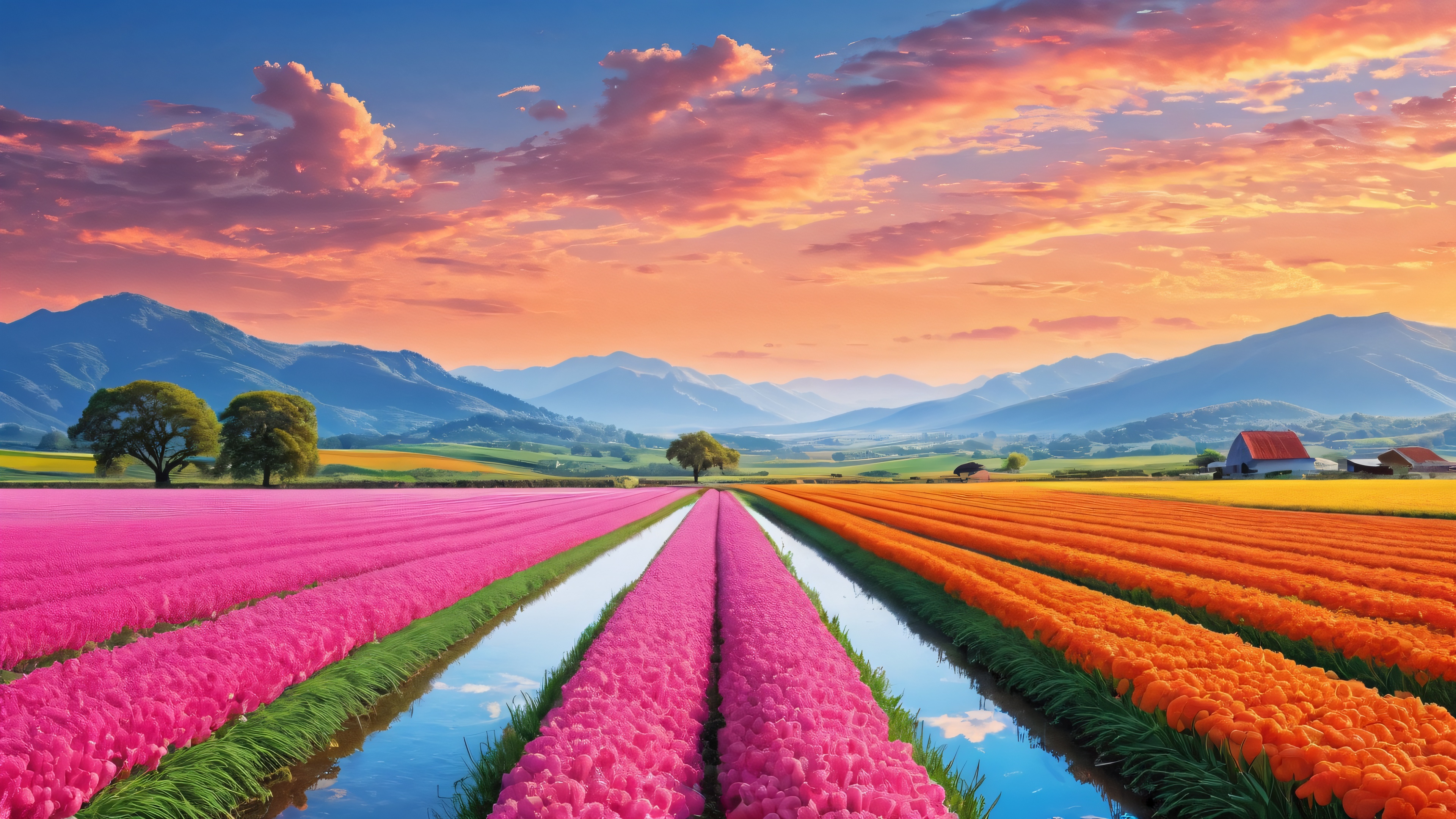 A breathtaking desktop wallpaper of farm, perfectly clean vast pure void, extreme depth of field, award-winning digital art, pristine clarity, ETHEREAL LIGHTING. Radiant, brilliant colors, ray traced reflections, and pristine clarity. Bright and airy., [‘pink’, ‘orange’, ‘blue’], 16:9 aspect ratio, ethereal lighting, radiant, brilliant colors, ray traced reflections, pristine clarity, award-winning digital art, epic breathtaking scale, stunning visual impact, perfect composition, highly textured surfaces, intricate micro-details, physically based rendering, macOS wallpaper aesthetic, masterpiece, highest quality, highly detailed, 8k resolution.