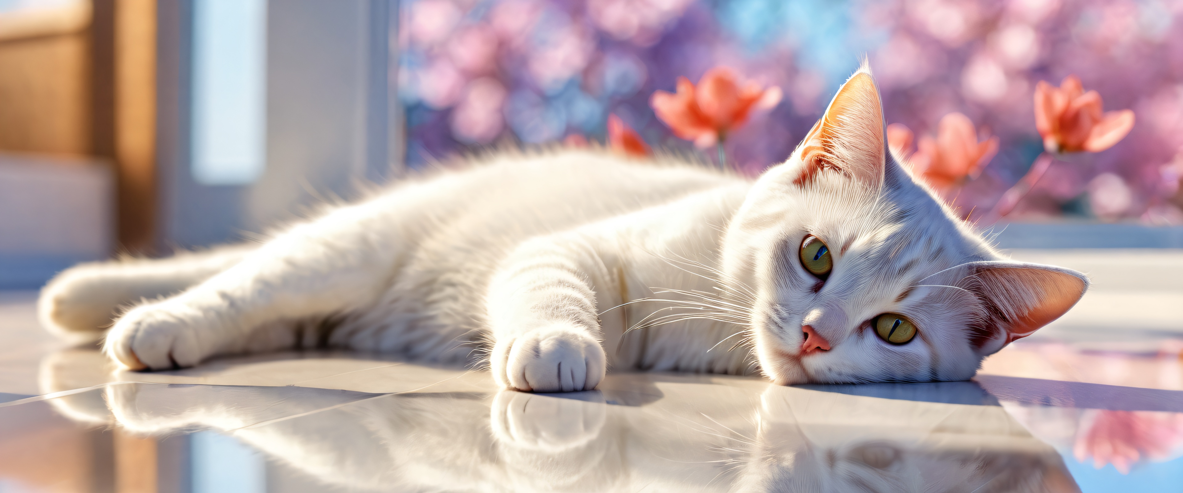 A breathtaking desktop wallpaper of Cat, Perfectly clean vast pure void with extreme depth of field, Award-winning digital art with pristine clarity, Ethereal lighting with radiant, brilliant colors, ray-traced reflections, and pristine clarity. Bright and airy., #FFC5C5, 21:9 ultrawide panoramic aspect ratio, epic wide shot, ethereal lighting, radiant, brilliant colors, ray traced reflections, pristine clarity, award-winning digital art, epic breathtaking scale, stunning visual impact, perfect composition, highly textured surfaces, intricate micro-details, physically based rendering, macOS wallpaper aesthetic, masterpiece, highest quality, highly detailed, 8k resolution.