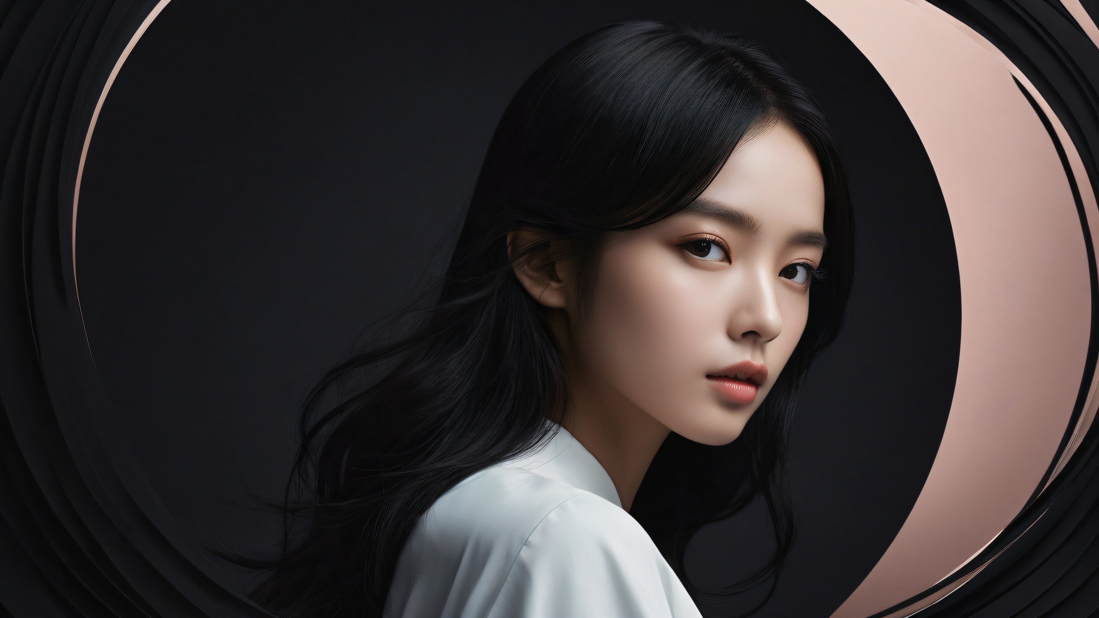 A breathtaking desktop wallpaper of Girl, Perfectly clean vast pure void, extreme depth of field, Award-winning digital art, pristine clarity, SLEEK DARK MODE AESTHETIC. Deep perfect blacks, striking crisp contrast, and elegant luminescent accents., [‘Feminine Pastel’, ‘Earthy Tones’], 16:9 aspect ratio, elegant low-key lighting, deep perfect blacks, striking contrast, sleek dark mode aesthetic, luminescent accents, deep rich colors, award-winning digital art, epic breathtaking scale, stunning visual impact, perfect composition, highly textured surfaces, intricate micro-details, physically based rendering, macOS wallpaper aesthetic, masterpiece, highest quality, highly detailed, 8k resolution.