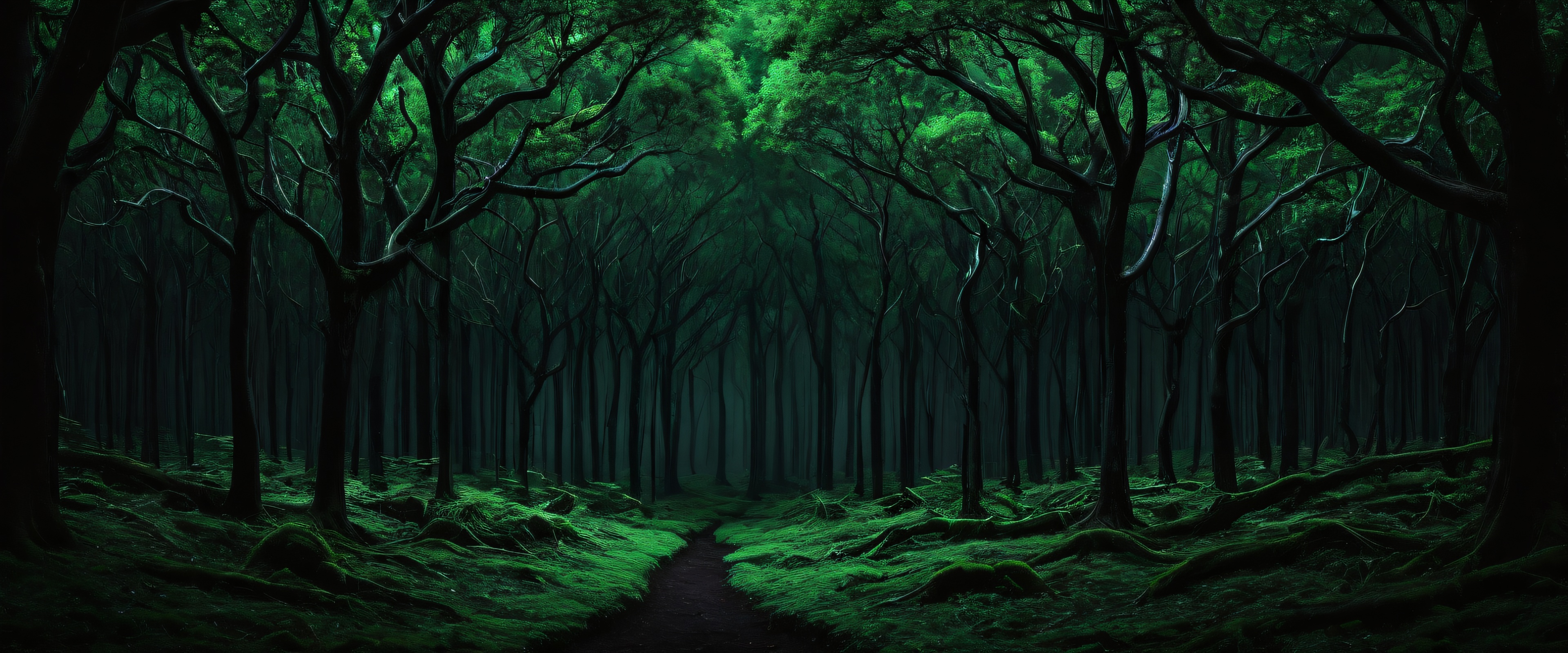 A breathtaking desktop wallpaper of Trees, perfectly clean vast pure void, extreme depth of field, award-winning digital art, pristine clarity, SLEEK DARK MODE AESTHETIC. Deep perfect blacks, striking crisp contrast, and elegant luminescent accents., Green, 21:9 ultrawide panoramic aspect ratio, epic wide shot, elegant low-key lighting, deep perfect blacks, striking contrast, sleek dark mode aesthetic, luminescent accents, deep rich colors, award-winning digital art, epic breathtaking scale, stunning visual impact, perfect composition, highly textured surfaces, intricate micro-details, physically based rendering, macOS wallpaper aesthetic, masterpiece, highest quality, highly detailed, 8k resolution.