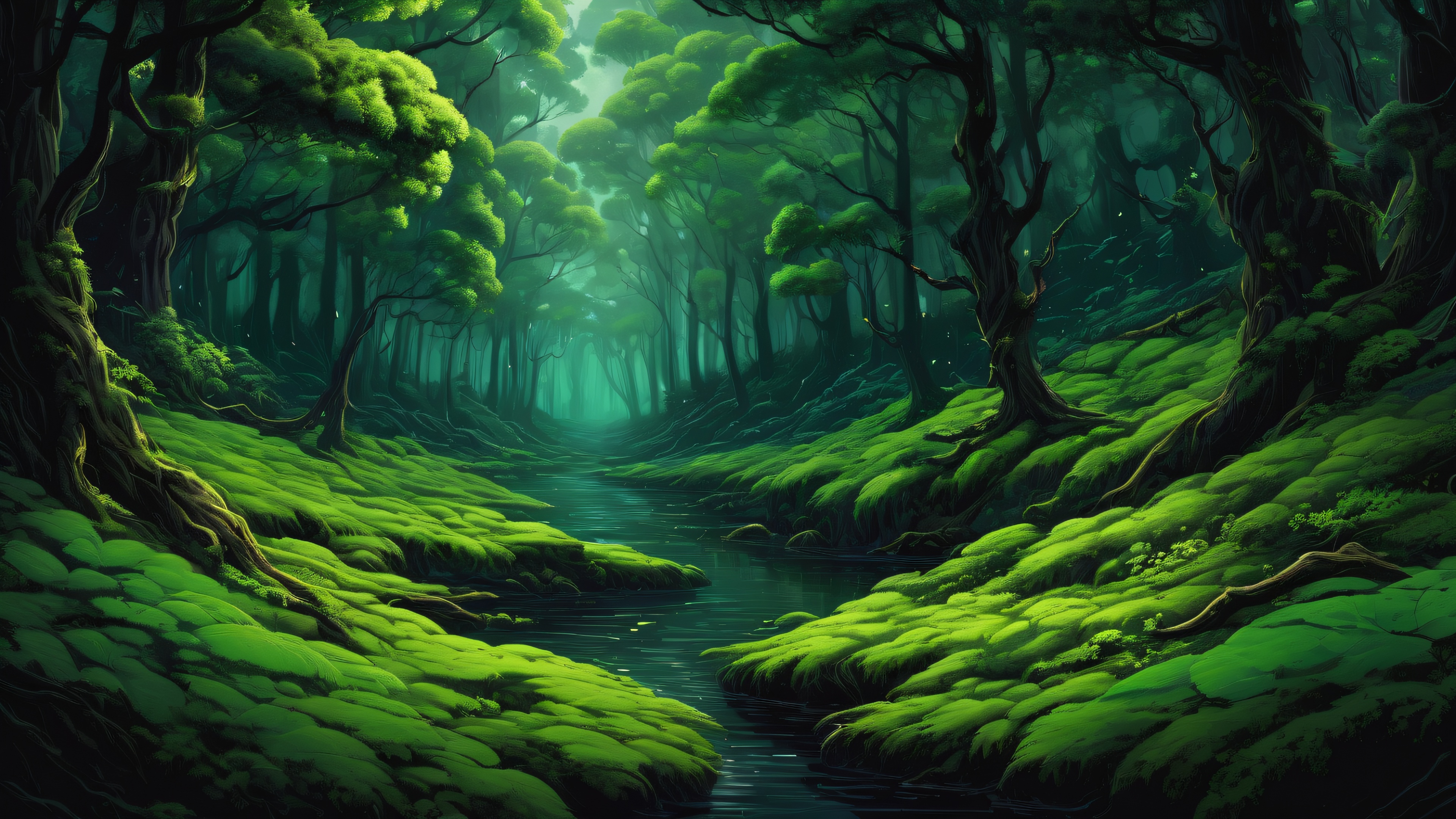 Breathtaking desktop wallpaper of a pristine forest for PC and Desktop use. Perfectly clean and vast with extreme depth of field, award-winning digital art, and sleek dark mode aesthetic.