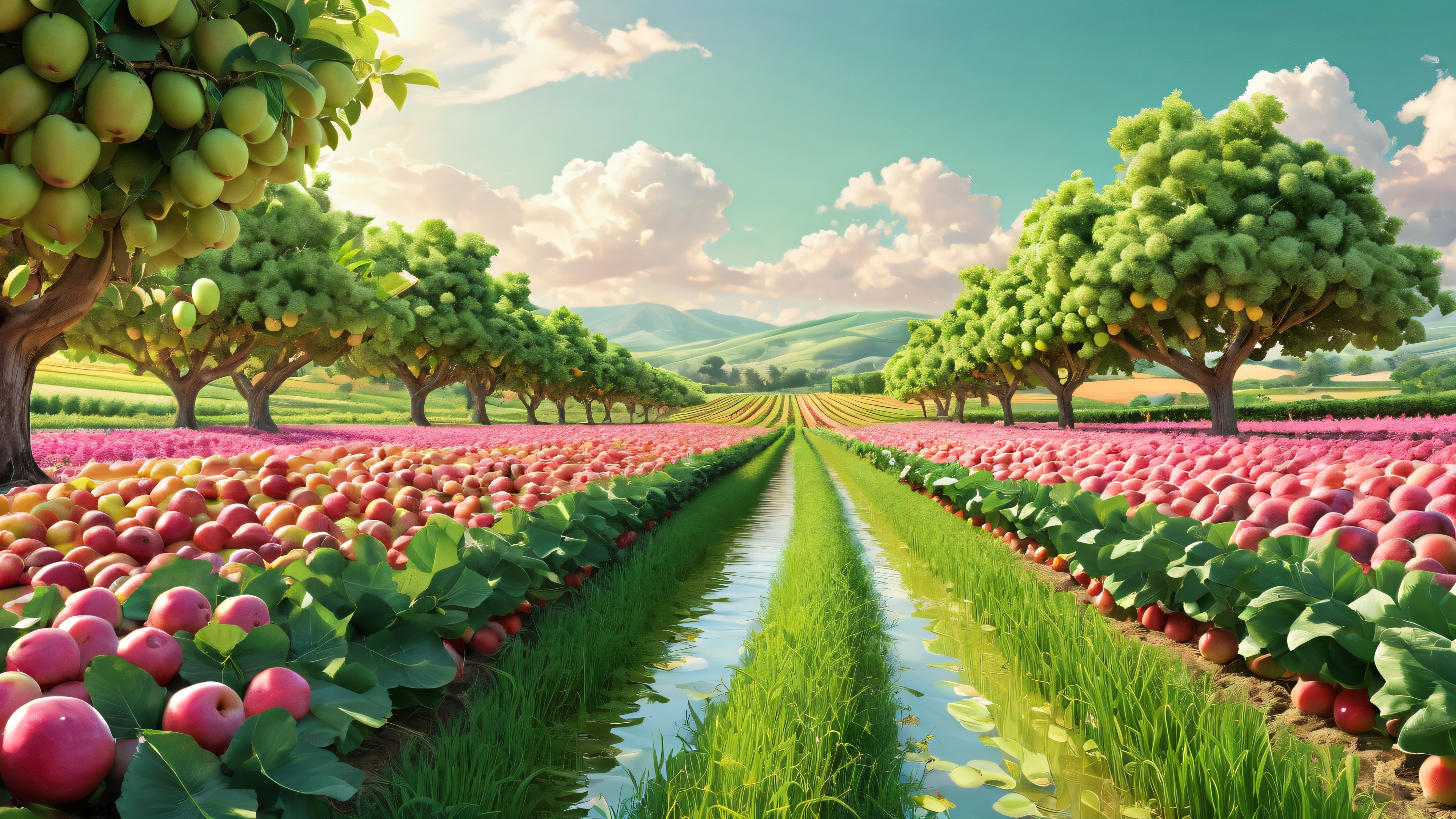 A stunning 8K resolution digital artwork featuring a breathtakingly detailed fruit farm scene with an extreme depth of field, showcasing the intricate textures and micro-details of the landscape. The soft ethereal lighting creates a sense of warmth and serenity, while the vibrant green hues and playful illustrations add a touch of whimsy.