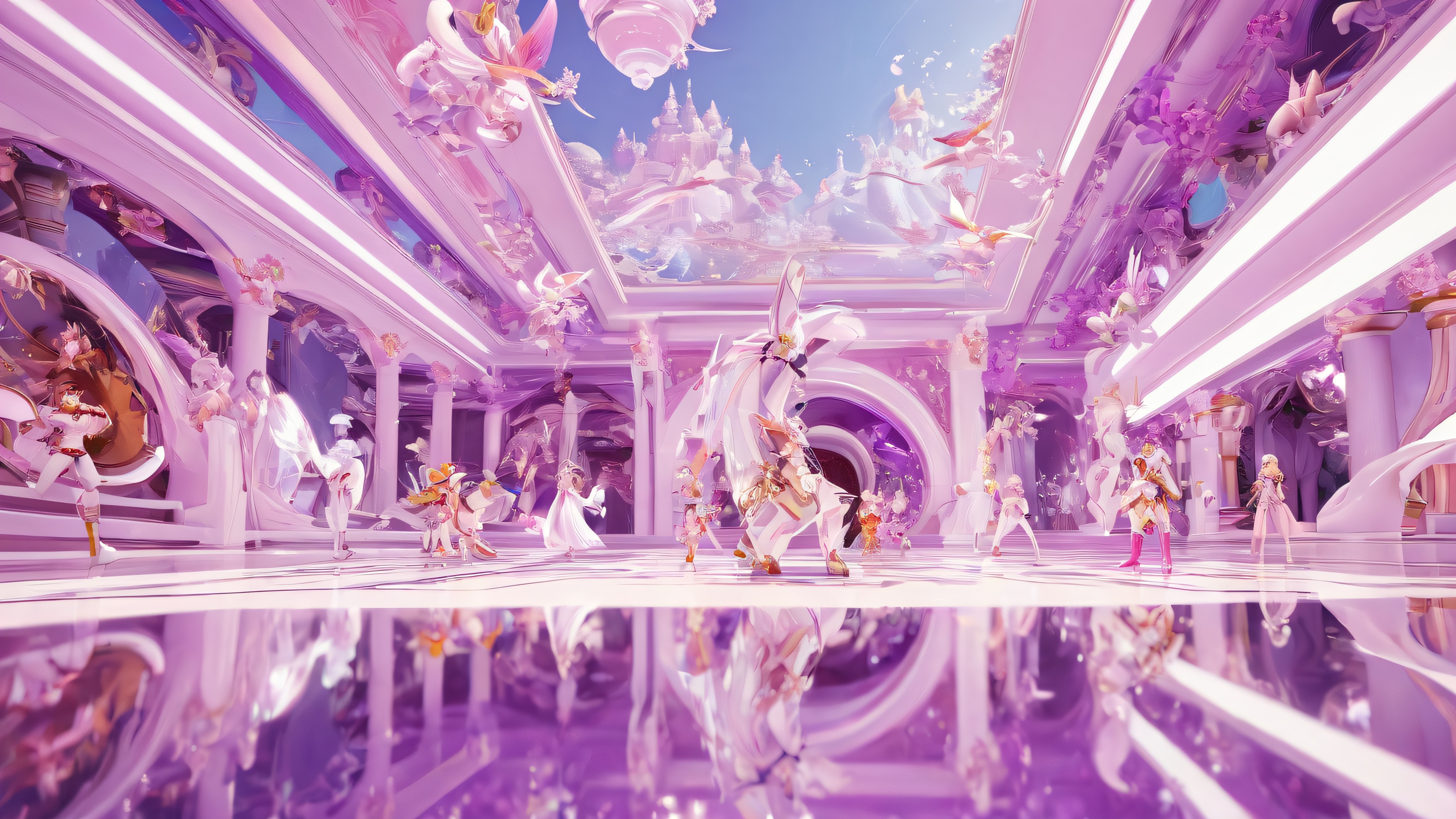 A breathtaking desktop wallpaper of Video Game Characters, Perfectly clean vast pure void, extreme depth of field, Award-winning digital art, pristine clarity, Ethereal lighting. Radiant, brilliant colors, ray traced reflections, and pristine clarity. Bright and airy., [‘Pinky-Purple’, ‘Creamy White’], 16:9 aspect ratio, ethereal lighting, radiant, brilliant colors, ray traced reflections, pristine clarity, award-winning digital art, epic breathtaking scale, stunning visual impact, perfect composition, highly textured surfaces, intricate micro-details, physically based rendering, macOS wallpaper aesthetic, masterpiece, highest quality, highly detailed, 8k resolution.