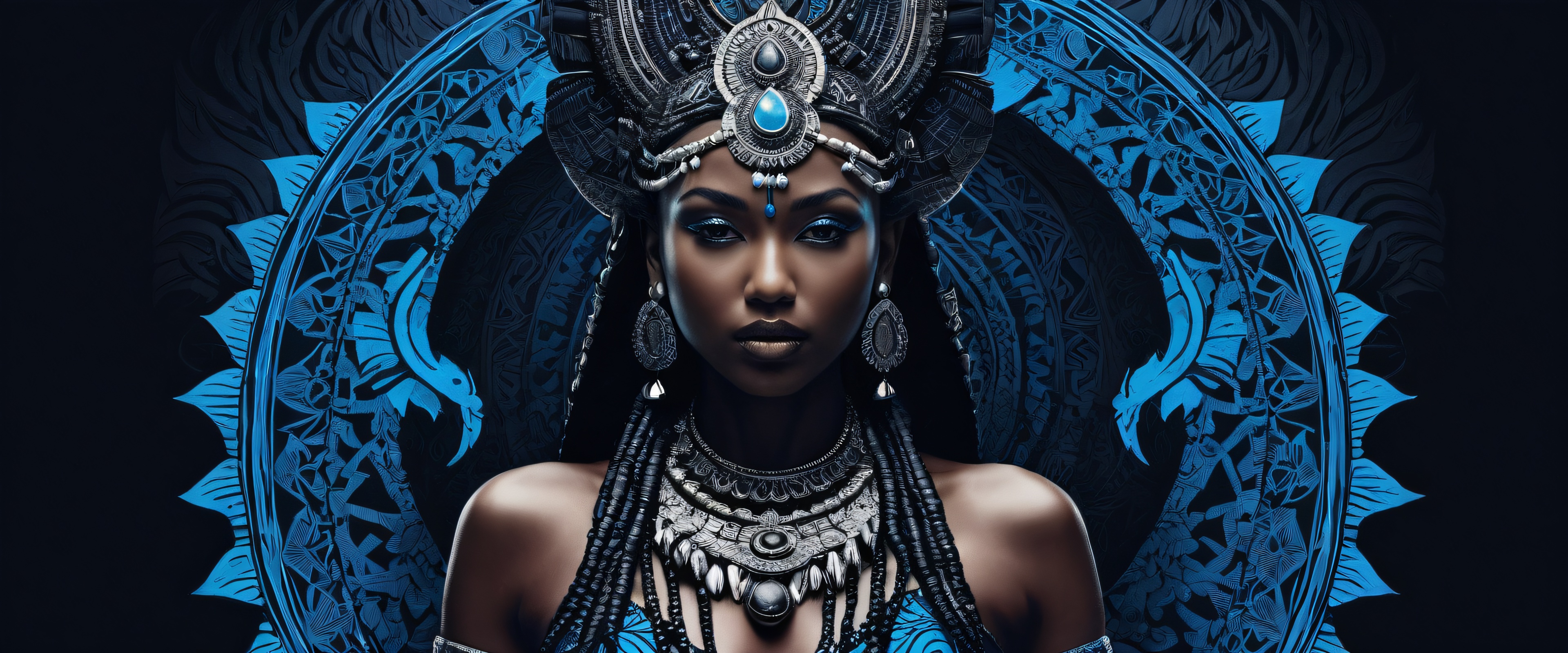 A breathtaking desktop wallpaper of Tribal Goddess, Perfectly clean vast pure void with extreme depth of field, allowing for striking visual contrast, Award-winning digital art with pristine clarity, featuring intricate details and textures, Sleek dark mode aesthetic with deep perfect blacks, crisp contrast, and elegant luminescent accents, [‘Glowing Blue’, ‘Ethereal Whites’], 21:9 ultrawide panoramic aspect ratio, epic wide shot, elegant low-key lighting, deep perfect blacks, striking contrast, sleek dark mode aesthetic, luminescent accents, deep rich colors, award-winning digital art, epic breathtaking scale, stunning visual impact, perfect composition, highly textured surfaces, intricate micro-details, physically based rendering, macOS wallpaper aesthetic, masterpiece, highest quality, highly detailed, 8k resolution.