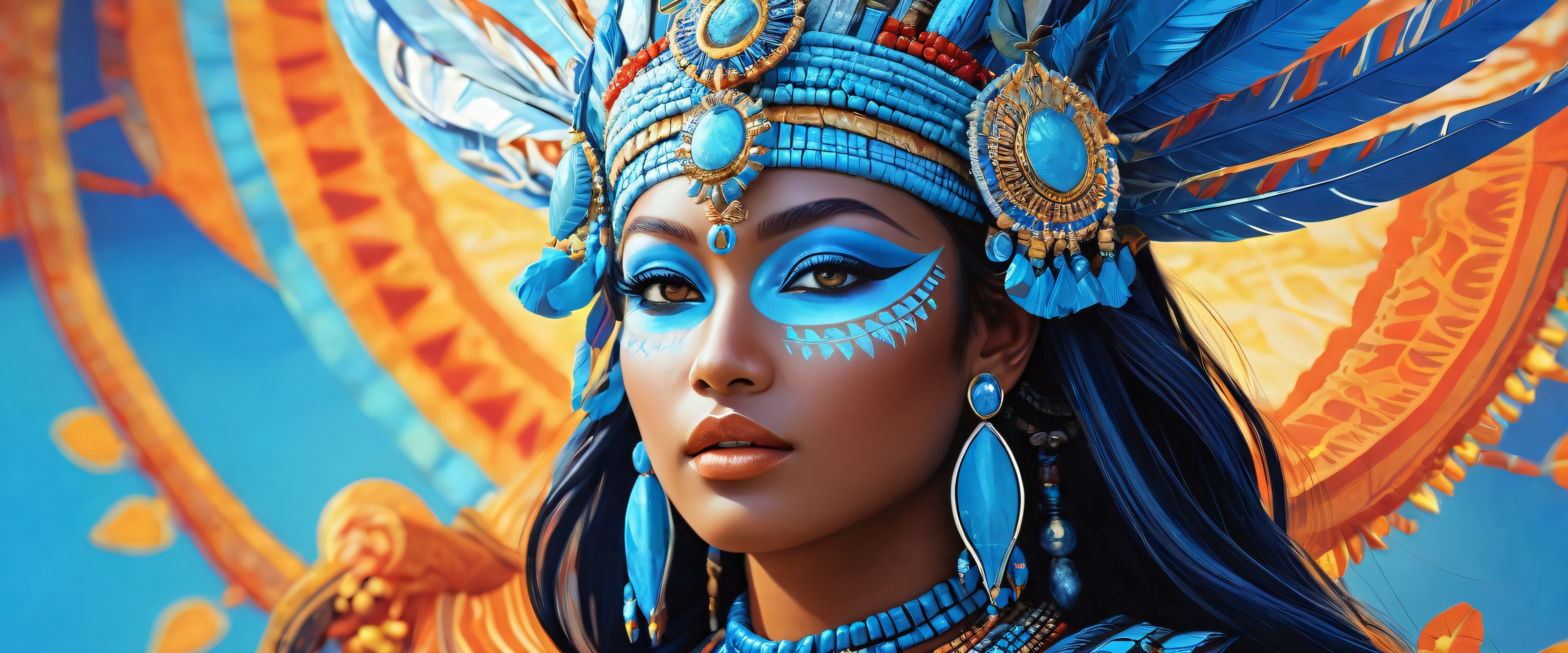 A breathtaking desktop wallpaper of Tribal Goddess, Perfectly clean vast pure void, extreme depth of field, Award-winning digital art, pristine clarity, Ethereal lighting: Radiant, brilliant colors, ray traced reflections, and pristine clarity. Bright and airy., {‘dominant’: ‘Glowing Blue’}, 21:9 ultrawide panoramic aspect ratio, epic wide shot, ethereal lighting, radiant, brilliant colors, ray traced reflections, pristine clarity, award-winning digital art, epic breathtaking scale, stunning visual impact, perfect composition, highly textured surfaces, intricate micro-details, physically based rendering, macOS wallpaper aesthetic, masterpiece, highest quality, highly detailed, 8k resolution.