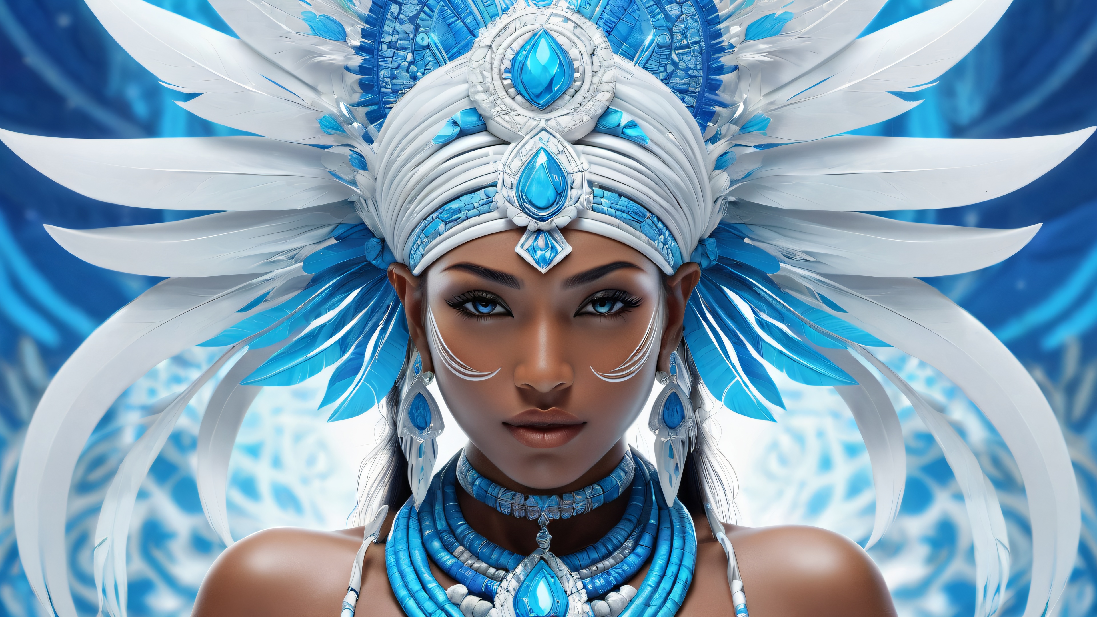 A breathtaking desktop wallpaper of Tribal Goddess, Perfectly clean vast pure void, extreme depth of field, Award-winning digital art, pristine clarity, Ethereal lighting with radiant, brilliant colors, ray traced reflections, and pristine clarity. Bright and airy., [‘Glowing Blue’, ‘White’], 16:9 aspect ratio, ethereal lighting, radiant, brilliant colors, ray traced reflections, pristine clarity, award-winning digital art, epic breathtaking scale, stunning visual impact, perfect composition, highly textured surfaces, intricate micro-details, physically based rendering, macOS wallpaper aesthetic, masterpiece, highest quality, highly detailed, 8k resolution.