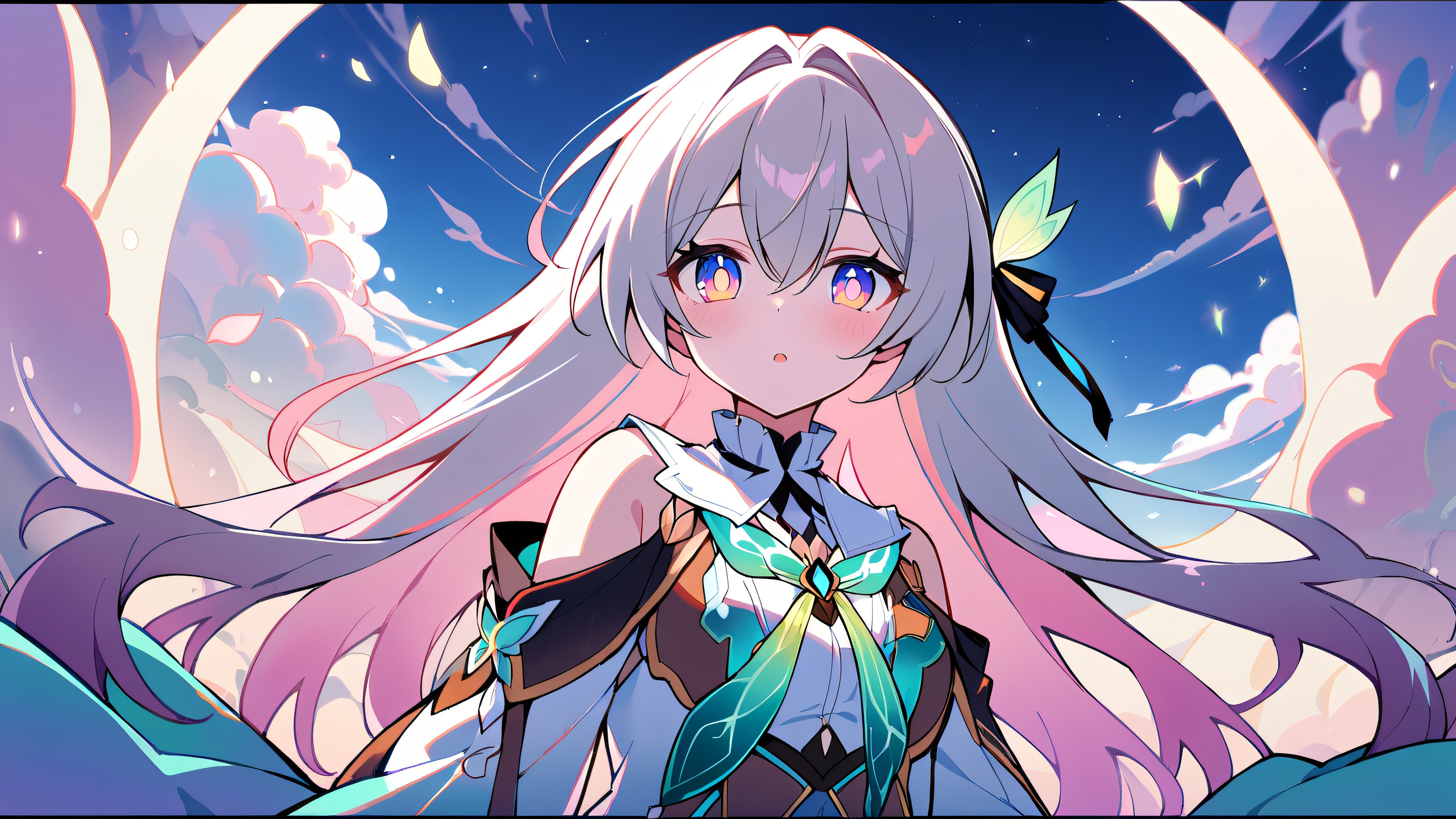 1girl, firefly, honkai: star rail, solo, masterpiece, best quality, very aesthetic, absurdres, highly detailed, looking at viewer, Perfectly clean vast pure void, extreme depth of field, [‘Pastel pink’, ‘Soft peach’, ‘Creamy white’], 16:9 aspect ratio, bright and airy, ethereal lighting, beautiful sky, cinematic lighting, vivid colors