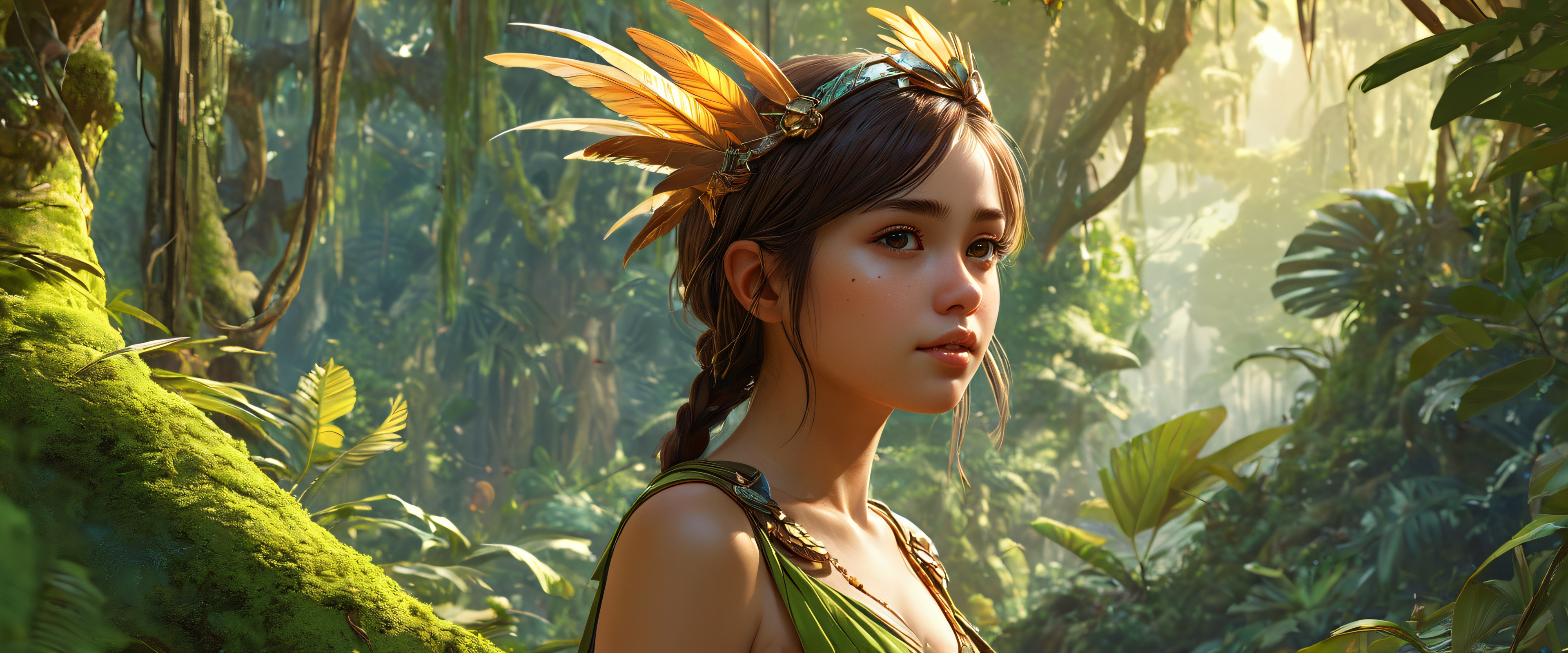 Step into an otherworldly oasis, where the lush jungle foliage meets the radiant glow of ethereal lighting. The award-winning digital art features a stunning harpy girl amidst highly textured surfaces, intricate micro-details, and physically based rendering. The 21:9 ultrawide panoramic aspect ratio creates an epic wide shot, drawing you into the breathtaking scale of this fantasy masterpiece.