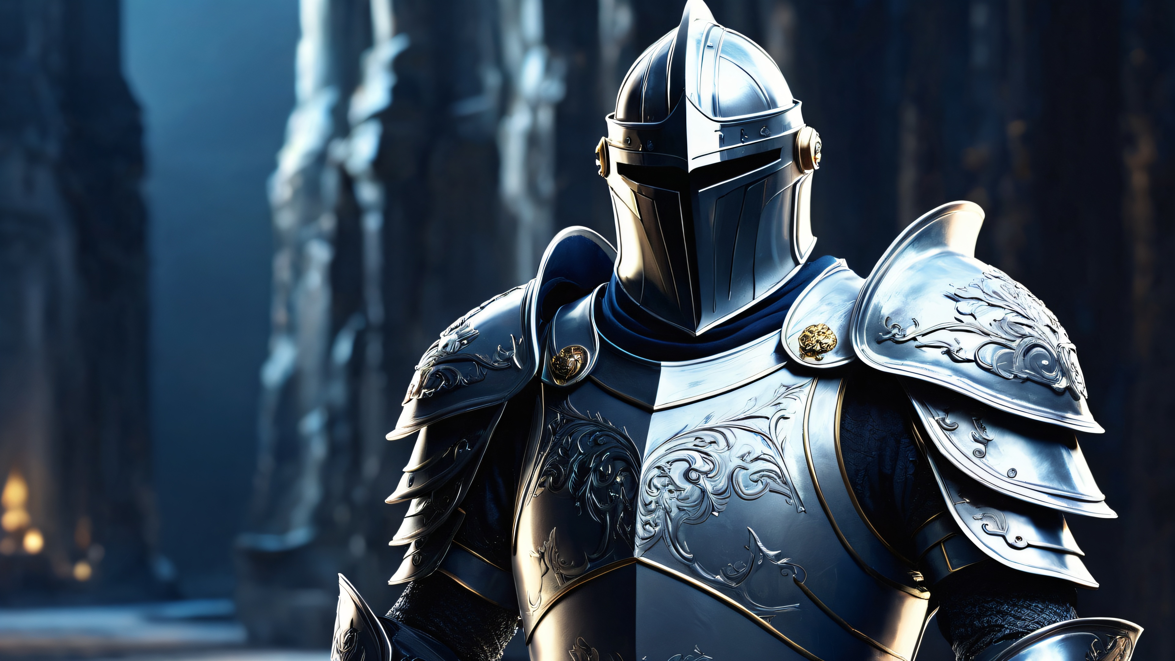 A breathtaking desktop wallpaper of Knight, Perfectly clean vast pure void, extreme depth of field; Layered paint background almost abstract, Award-winning digital art, pristine clarity; Heavy impasto with tactile realism, Ethereal lighting; Radiant, brilliant colors, ray traced reflections, and pristine clarity. Bright and airy., [‘Dark Blues’, ‘Metallic Silvers’], 16:9 aspect ratio, ethereal lighting, radiant, brilliant colors, ray traced reflections, pristine clarity, award-winning digital art, epic breathtaking scale, stunning visual impact, perfect composition, highly textured surfaces, intricate micro-details, physically based rendering, macOS wallpaper aesthetic, masterpiece, highest quality, highly detailed, 8k resolution.