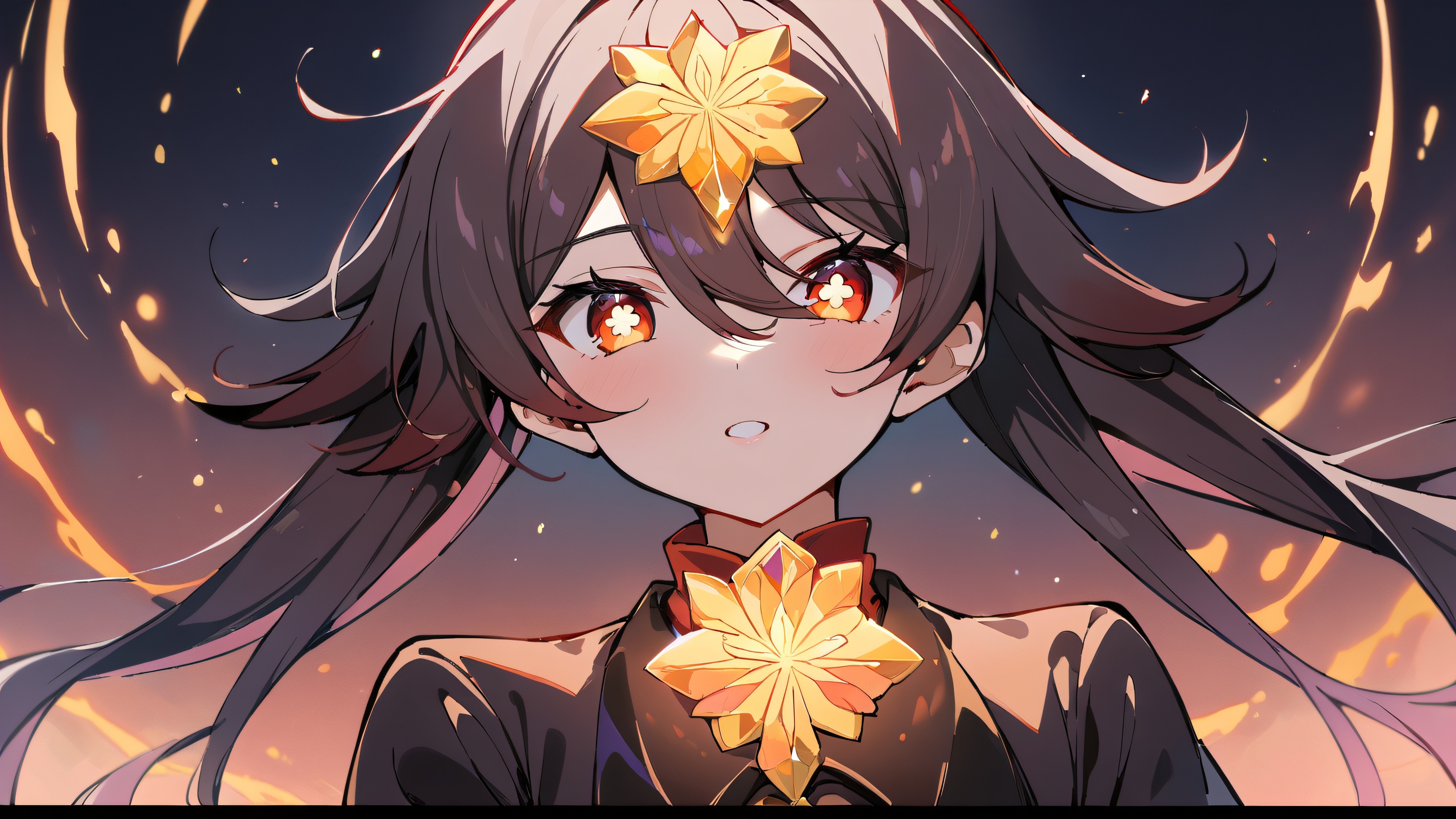 1girl, hu tao, genshin impact, solo, masterpiece, best quality, very aesthetic, absurdres, highly detailed, looking at viewer, Perfectly clean vast pure void, extreme depth of field, with subtle gradient effects to emphasize the knight’s grandeur, [‘Warm golds and silvers’, ‘Deep blues and purples’, ‘Vibrant reds and oranges’], 16:9 aspect ratio, bright and airy, ethereal lighting, beautiful sky, cinematic lighting, vivid colors