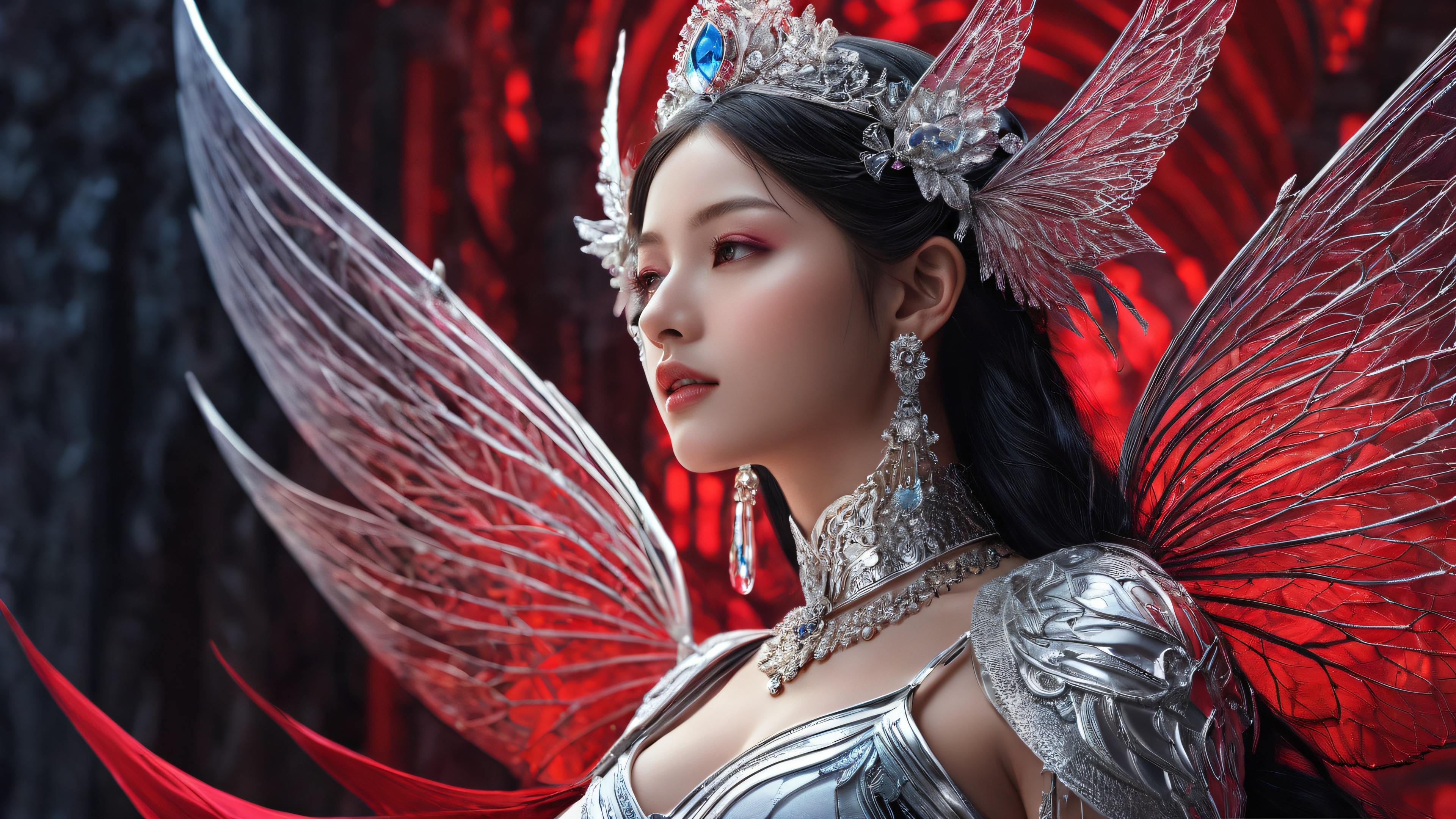 A breathtaking desktop wallpaper of Ethereal Maiden, Perfectly clean vast pure void with extreme depth of field, illuminated by ethereal lighting, Award-winning digital art with pristine clarity and intricate details, Ethereal Lighting: Radiant, brilliant colors, ray-traced reflections, and pristine clarity, bright and airy, [‘Deep Berry Red’, ‘Midnight Black’, ‘Metallic Silver’], 16:9 aspect ratio, ethereal lighting, radiant, brilliant colors, ray traced reflections, pristine clarity, award-winning digital art, epic breathtaking scale, stunning visual impact, perfect composition, highly textured surfaces, intricate micro-details, physically based rendering, macOS wallpaper aesthetic, masterpiece, highest quality, highly detailed, 8k resolution.