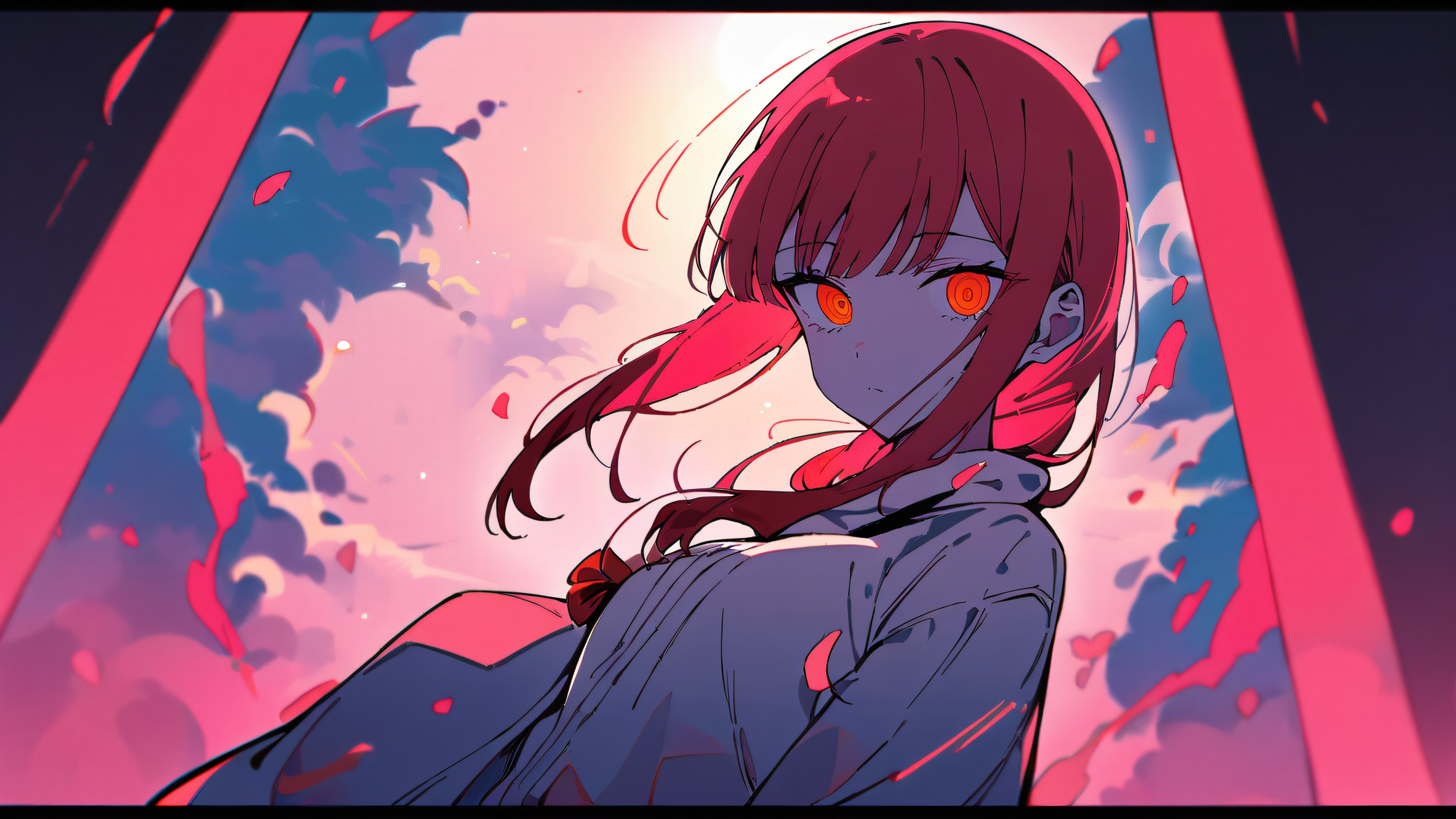 Immerse yourself in this stunning masterpiece featuring Makima from Chainsaw Man, solo and looking directly at the viewer. The vibrant pink and white hues set against an expansive pure void create a sense of depth and dimensionality. The soft focus effect emphasizes the anime girl’s delicate features, while the bright, airy lighting bathes the scene in a warm, cinematic glow.