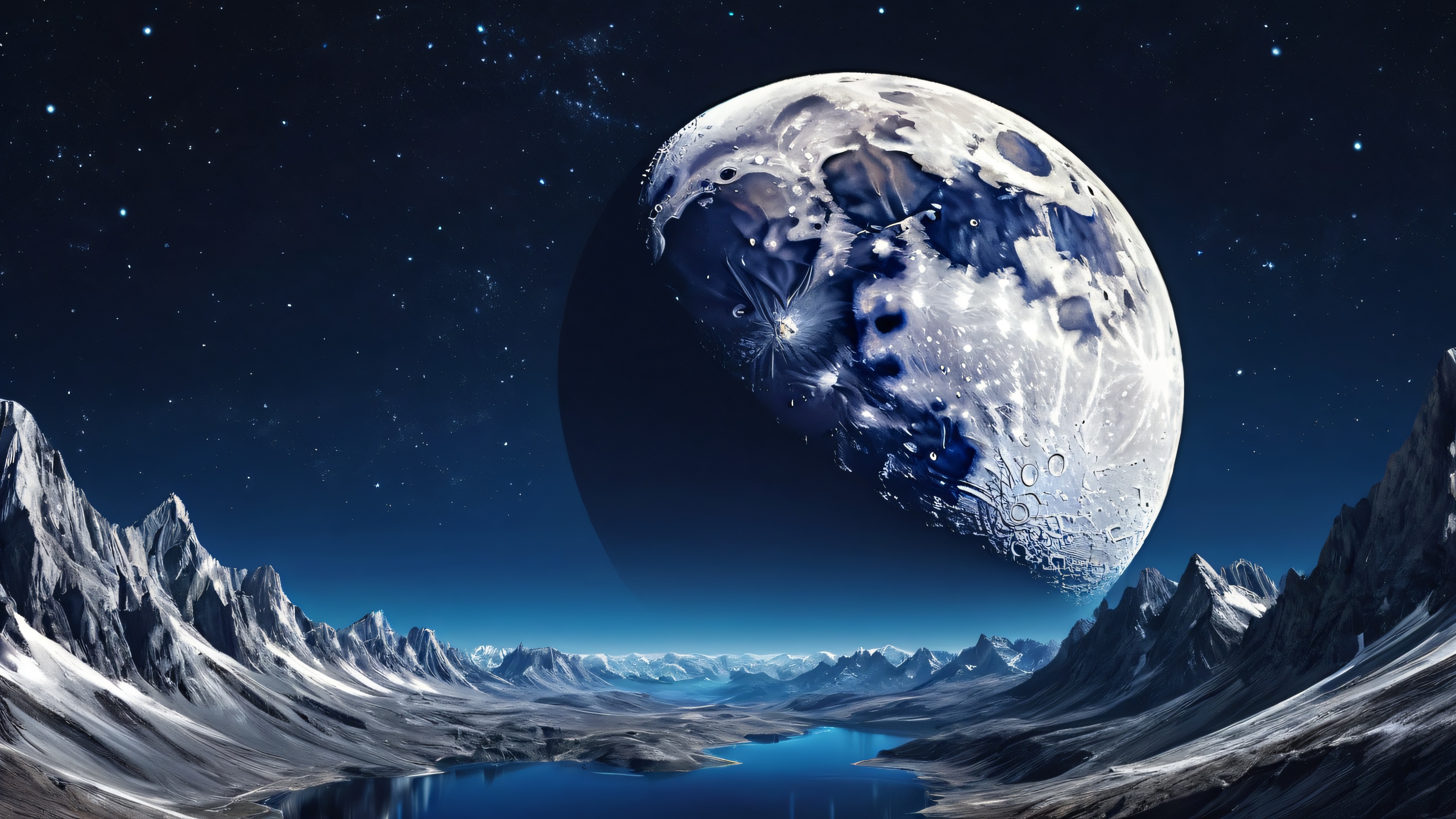 A breathtaking desktop wallpaper of Moon, Perfectly clean vast pure void, extreme depth of field with subtle starlight, Award-winning digital art, pristine clarity with intricate details and textures, Ethereal lighting with radiant, brilliant colors, ray traced reflections, and pristine clarity. Bright and airy., [‘Dark Blue’, ‘Bright White’], 16:9 aspect ratio, ethereal lighting, radiant, brilliant colors, ray traced reflections, pristine clarity, award-winning digital art, epic breathtaking scale, stunning visual impact, perfect composition, highly textured surfaces, intricate micro-details, physically based rendering, macOS wallpaper aesthetic, masterpiece, highest quality, highly detailed, 8k resolution.