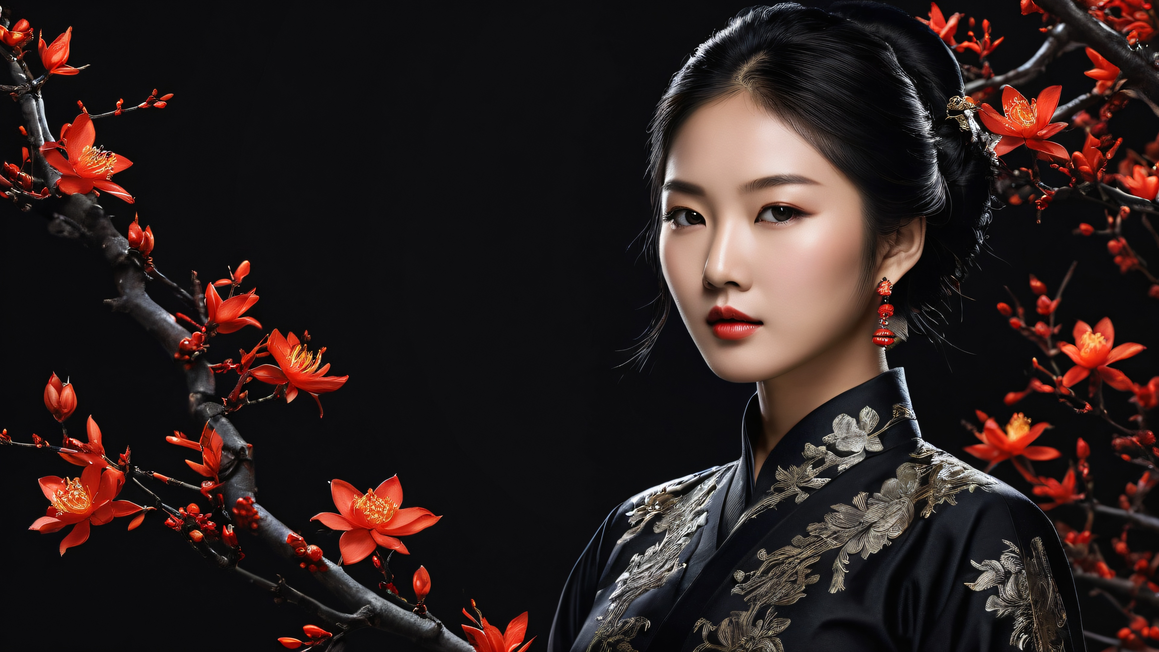 A breathtaking desktop wallpaper of Asian Woman, Perfectly clean vast pure void with extreme depth of field, creating an immersive atmosphere., Award-winning digital art with pristine clarity and intricate details., SLEEK DARK MODE AESTHETIC: Deep perfect blacks, striking crisp contrast, and elegant luminescent accents., [‘#333’, ‘#444’, ‘#222’, ‘#FFC080’], 16:9 aspect ratio, elegant low-key lighting, deep perfect blacks, striking contrast, sleek dark mode aesthetic, luminescent accents, deep rich colors, award-winning digital art, epic breathtaking scale, stunning visual impact, perfect composition, highly textured surfaces, intricate micro-details, physically based rendering, macOS wallpaper aesthetic, masterpiece, highest quality, highly detailed, 8k resolution.