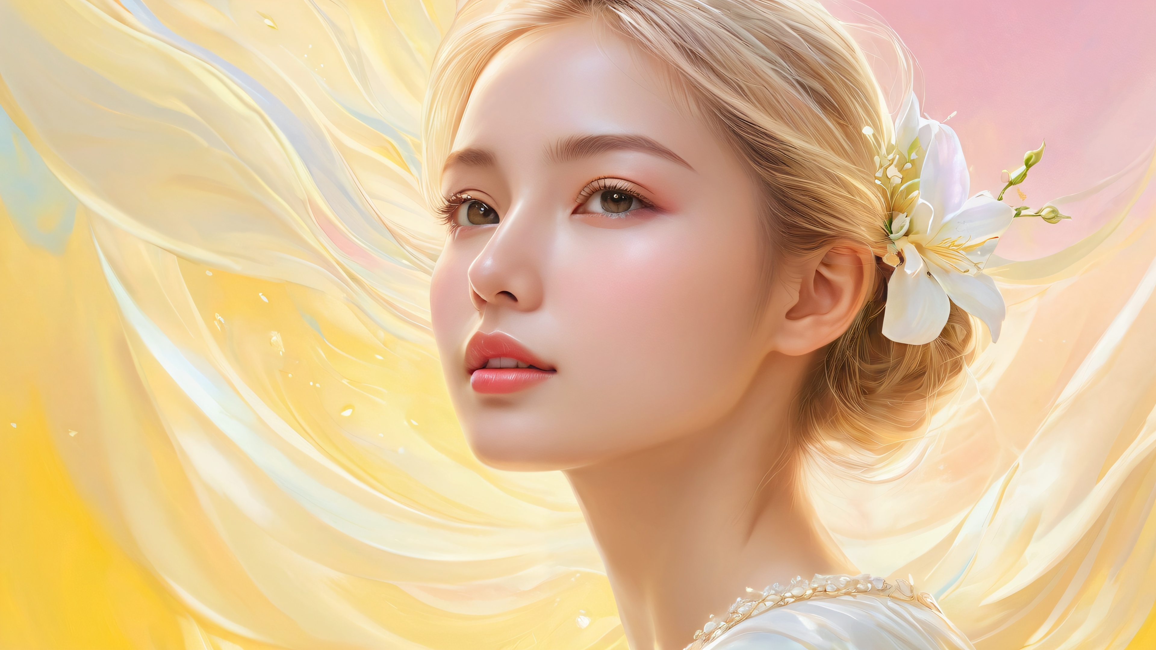A breathtaking desktop wallpaper of Woman, Perfectly clean vast pure void, extreme depth of field., Award-winning digital art, pristine clarity. Painterly approach with soft shading and gentle light., Ethereal lighting, Radiant brilliant colors, ray-traced reflections, Bright and airy with a focus on soft light., [‘Pastel Yellow’, ‘Cream’], 16:9 aspect ratio, ethereal lighting, radiant, brilliant colors, ray traced reflections, pristine clarity, award-winning digital art, epic breathtaking scale, stunning visual impact, perfect composition, highly textured surfaces, intricate micro-details, physically based rendering, macOS wallpaper aesthetic, masterpiece, highest quality, highly detailed, 8k resolution.