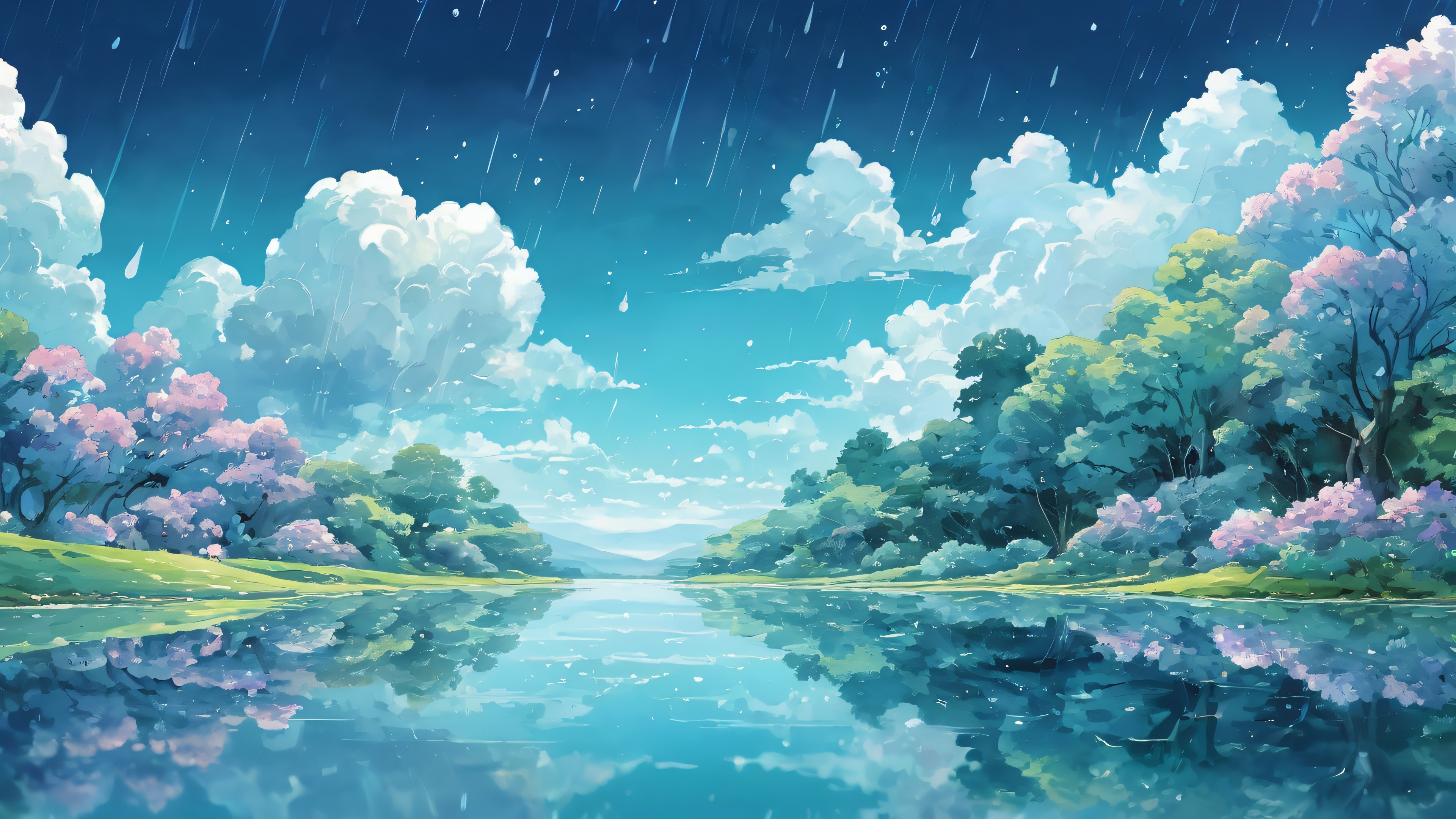 A breathtaking desktop wallpaper of Ditto, Perfectly clean vast pure void, extreme depth of field, melancholic atmosphere with rain and darkness, Award-winning digital art, pristine clarity, modern watercolor, Ethereal lighting: radiant, brilliant colors, ray-traced reflections, bright and airy, with a hint of sadness, [‘Soft blues’, ‘Whispery whites’, ‘Muted greens’], 16:9 aspect ratio, ethereal lighting, radiant, brilliant colors, ray traced reflections, pristine clarity, award-winning digital art, epic breathtaking scale, stunning visual impact, perfect composition, highly textured surfaces, intricate micro-details, physically based rendering, macOS wallpaper aesthetic, masterpiece, highest quality, highly detailed, 8k resolution.
