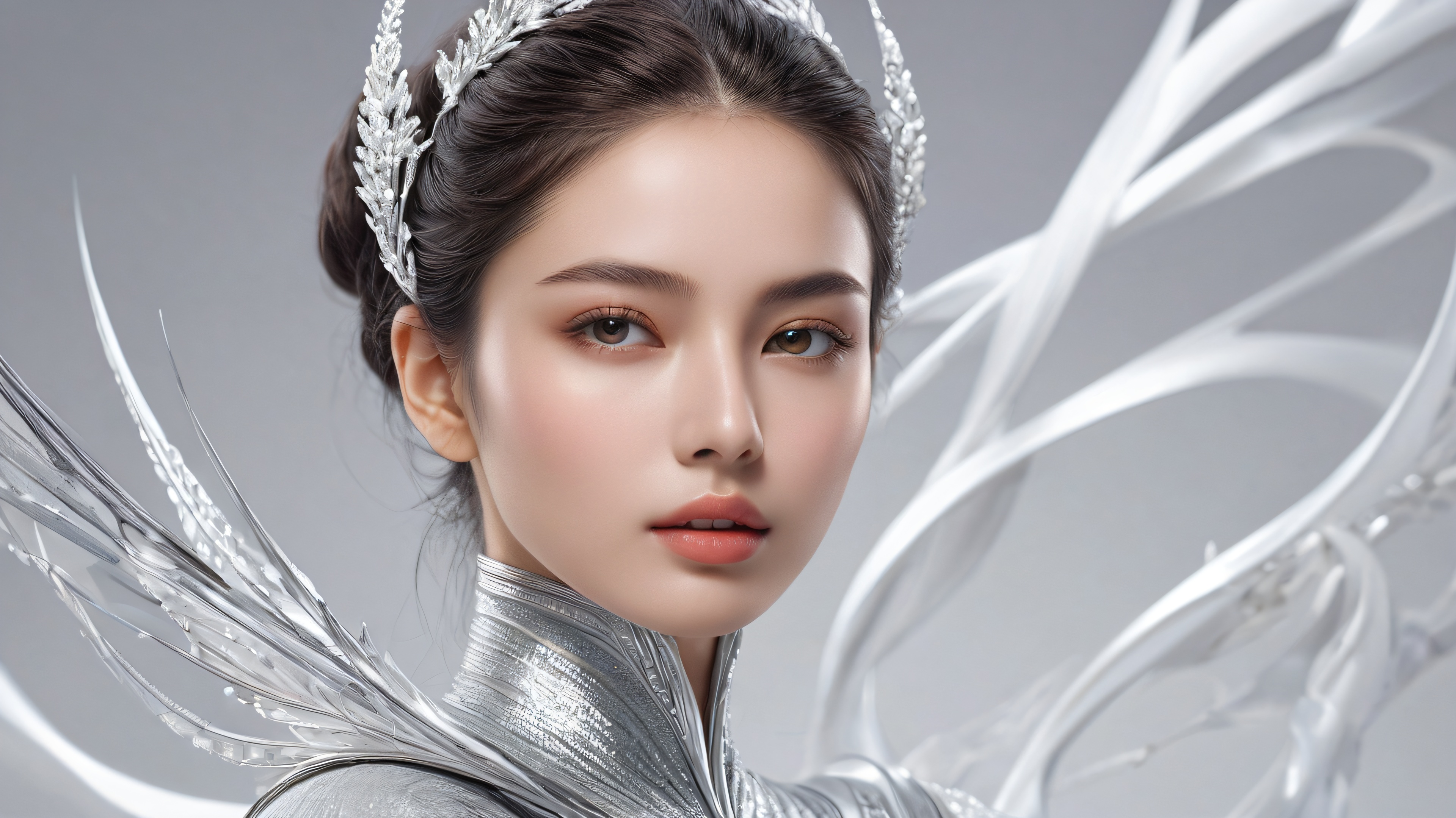 A breathtaking desktop wallpaper of Woman, Perfectly clean vast pure void, extreme depth of field, subtle gradient lighting, Award-winning digital art, pristine clarity, with intricate details and realistic textures, Ethereal lighting, radiant brilliant colors, ray-traced reflections, and pristine clarity. Bright and airy., [‘Dark Gray’, ‘White’, ‘Silver’], 16:9 aspect ratio, ethereal lighting, radiant, brilliant colors, ray traced reflections, pristine clarity, award-winning digital art, epic breathtaking scale, stunning visual impact, perfect composition, highly textured surfaces, intricate micro-details, physically based rendering, macOS wallpaper aesthetic, masterpiece, highest quality, highly detailed, 8k resolution.