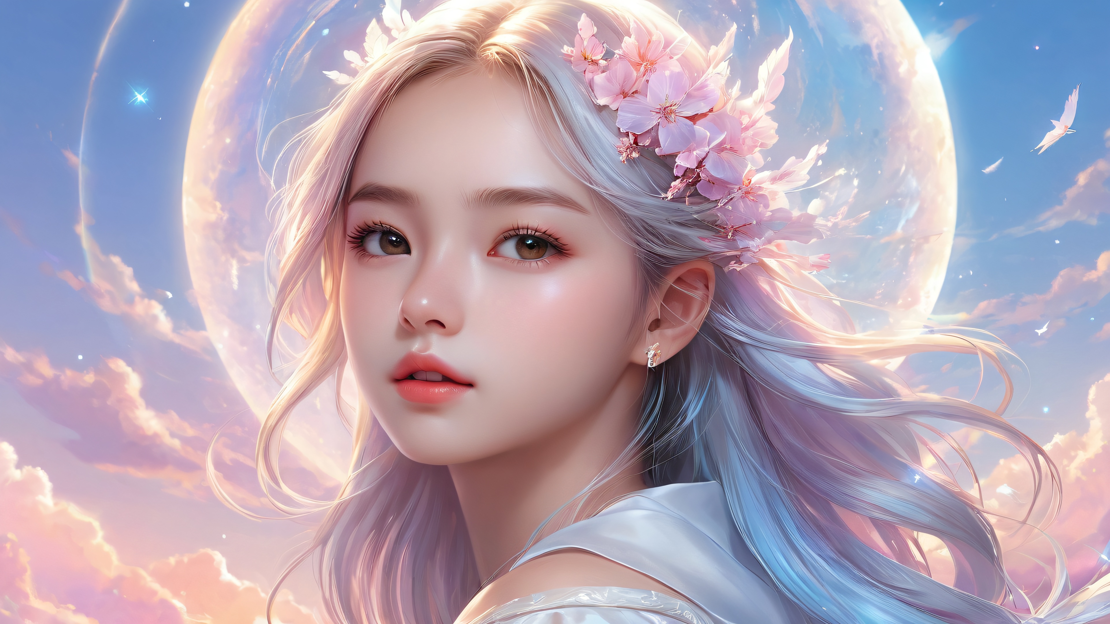 A breathtaking desktop wallpaper of 1Girl, perfectly clean vast pure void, extreme depth of field, award-winning digital art, pristine clarity, ETHEREAL LIGHTING. Radiant, brilliant colors, ray traced reflections, and pristine clarity. Bright and airy., Soft Pastel Hues, 16:9 aspect ratio, ethereal lighting, radiant, brilliant colors, ray traced reflections, pristine clarity, award-winning digital art, epic breathtaking scale, stunning visual impact, perfect composition, highly textured surfaces, intricate micro-details, physically based rendering, macOS wallpaper aesthetic, masterpiece, highest quality, highly detailed, 8k resolution.