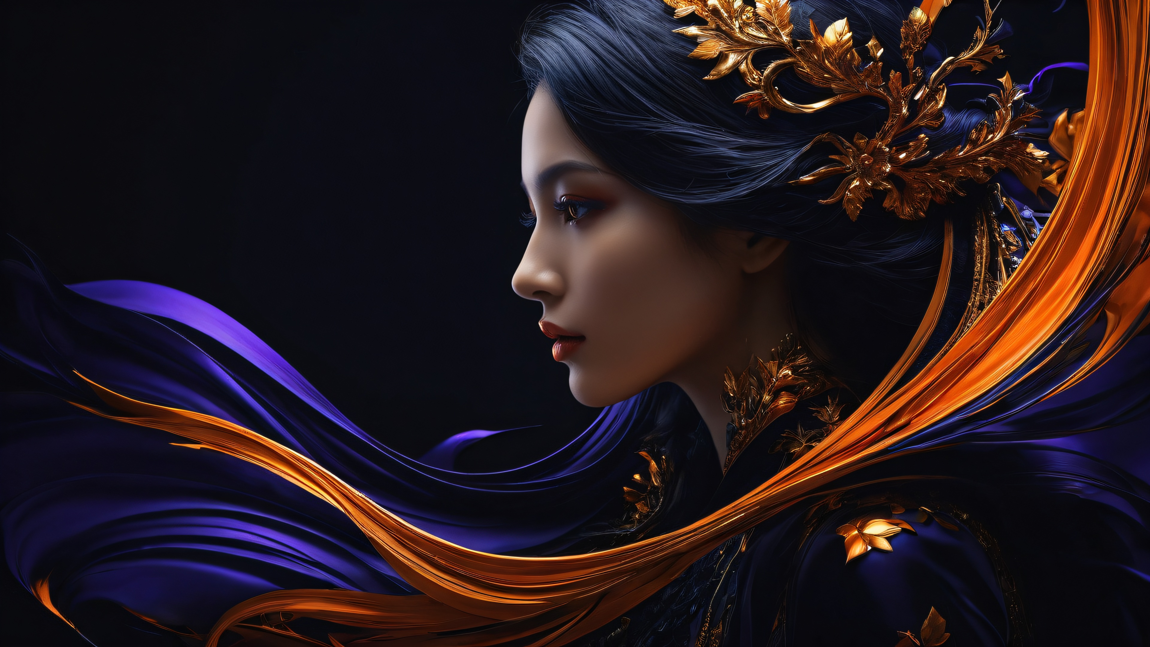A breathtaking desktop wallpaper of Woman, perfectly clean vast pure void, extreme depth of field, award-winning digital art, pristine clarity, SLEEK DARK MODE AESTHETIC. Deep perfect blacks, striking crisp contrast, and elegant luminescent accents., [‘deep blue’, ‘fiery orange’, ‘molten gold’, ‘purple’], 16:9 aspect ratio, elegant low-key lighting, deep perfect blacks, striking contrast, sleek dark mode aesthetic, luminescent accents, deep rich colors, award-winning digital art, epic breathtaking scale, stunning visual impact, perfect composition, highly textured surfaces, intricate micro-details, physically based rendering, macOS wallpaper aesthetic, masterpiece, highest quality, highly detailed, 8k resolution.