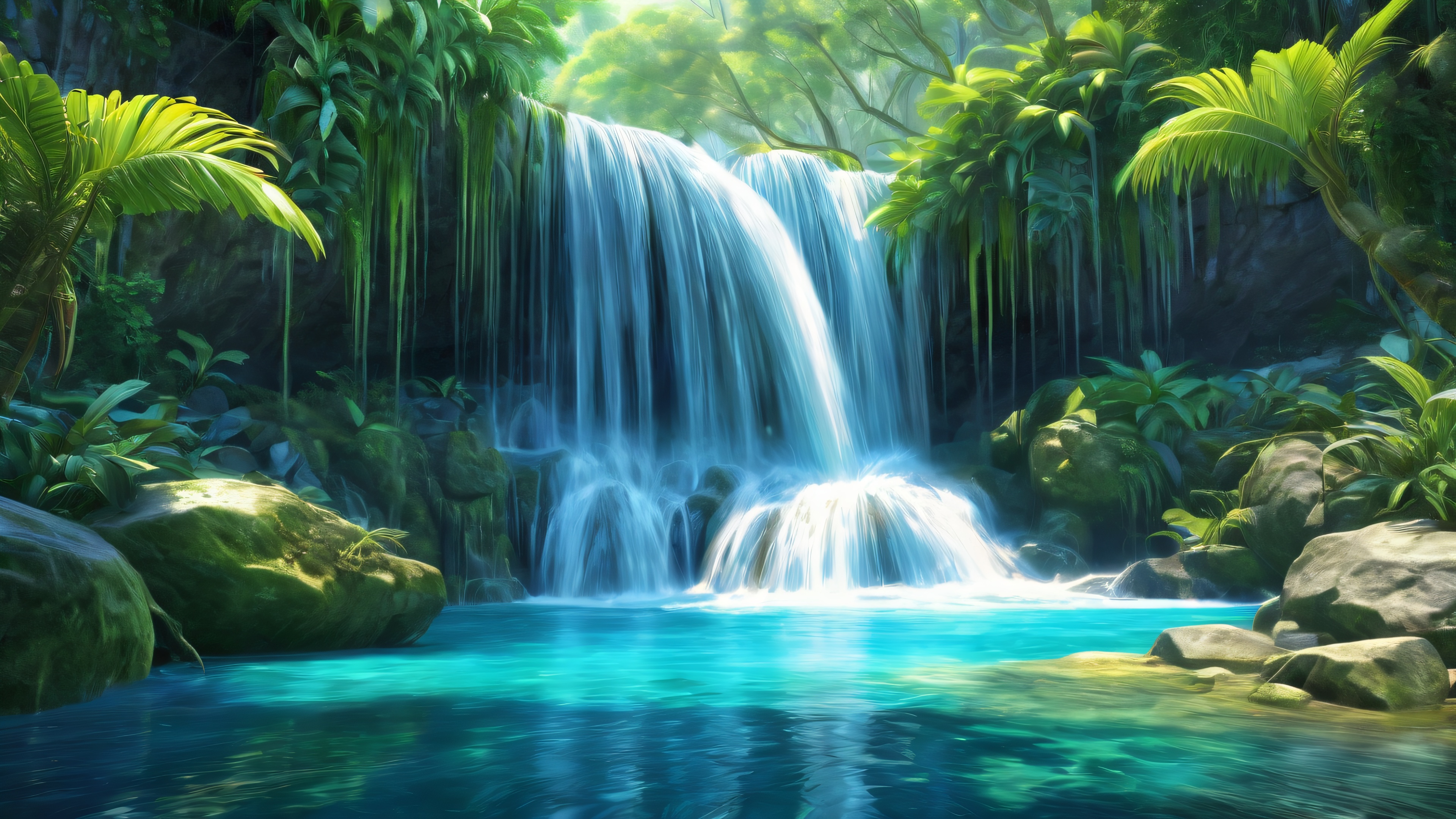 This majestic 8K resolution desktop wallpaper transports you to an otherworldly realm, where the pure void of a crystal-clear waterfall plunges into an abyss of radiant blues and greens. The depth of field is so extreme that the viewer’s gaze is drawn inexorably towards the luminous, award-winning digital artistry at play. The scene radiates brilliant colors, with ray-traced reflections that dance across its surface like shards of glass.