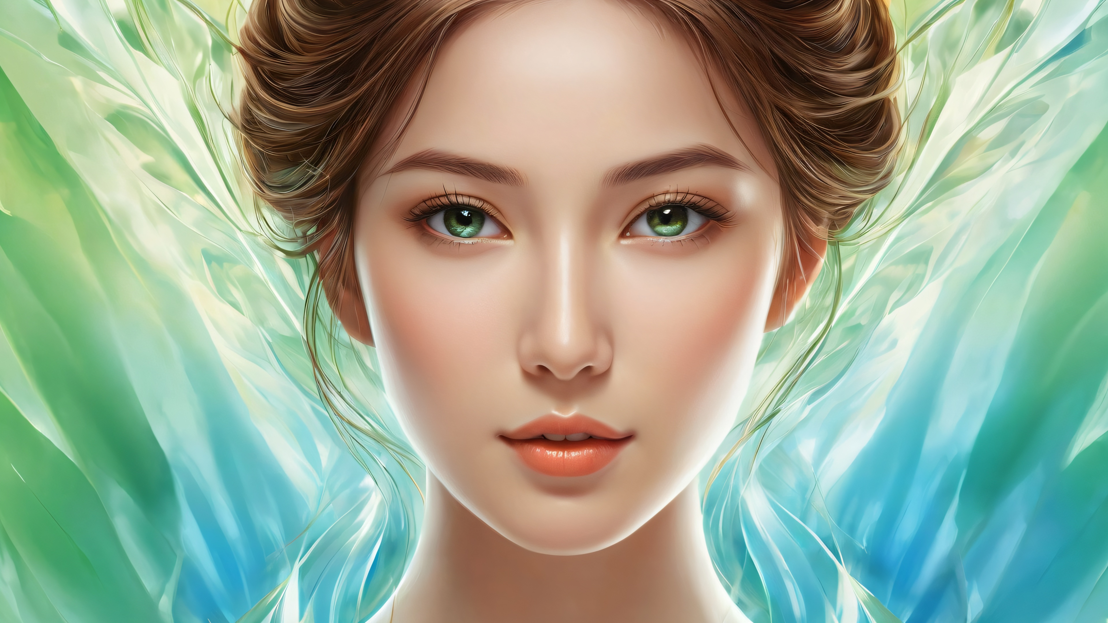 A breathtaking desktop wallpaper of Woman, perfectly clean vast pure void, extreme depth of field, award-winning digital art, pristine clarity, Ethereal Lighting: Radiant, brilliant colors, ray traced reflections, and pristine clarity. Bright and airy., [‘Green’, ‘Brown’, ‘Blue’], 16:9 aspect ratio, ethereal lighting, radiant, brilliant colors, ray traced reflections, pristine clarity, award-winning digital art, epic breathtaking scale, stunning visual impact, perfect composition, highly textured surfaces, intricate micro-details, physically based rendering, macOS wallpaper aesthetic, masterpiece, highest quality, highly detailed, 8k resolution.