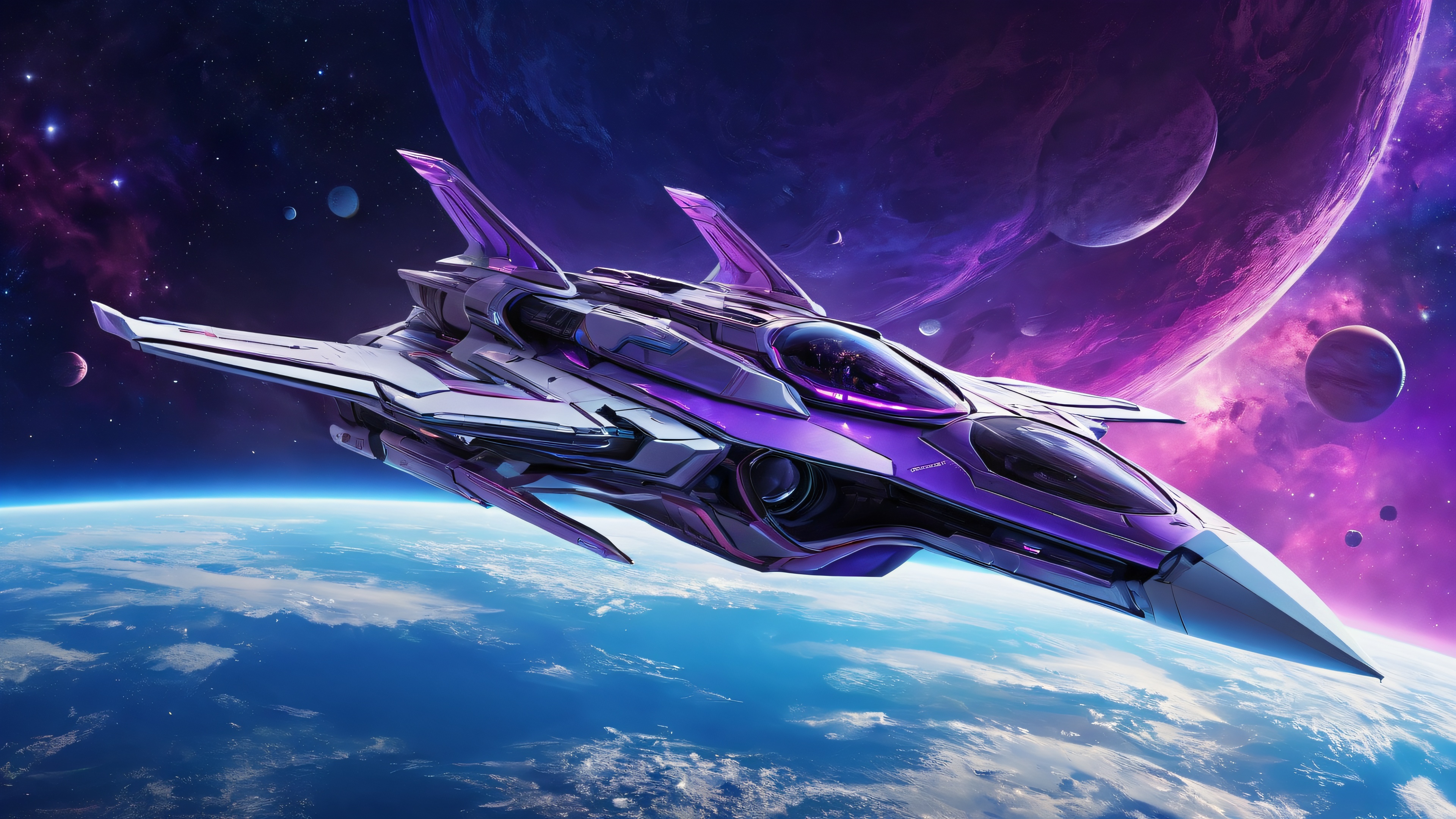 A breathtaking desktop wallpaper of Spaceship, Perfectly clean vast pure void, extreme depth of field, Award-winning digital art, pristine clarity, Ethereal lighting with radiant, brilliant colors, ray traced reflections, and pristine clarity. Bright and airy., [‘Blue’, ‘Purple’], 16:9 aspect ratio, ethereal lighting, radiant, brilliant colors, ray traced reflections, pristine clarity, award-winning digital art, epic breathtaking scale, stunning visual impact, perfect composition, highly textured surfaces, intricate micro-details, physically based rendering, macOS wallpaper aesthetic, masterpiece, highest quality, highly detailed, 8k resolution.