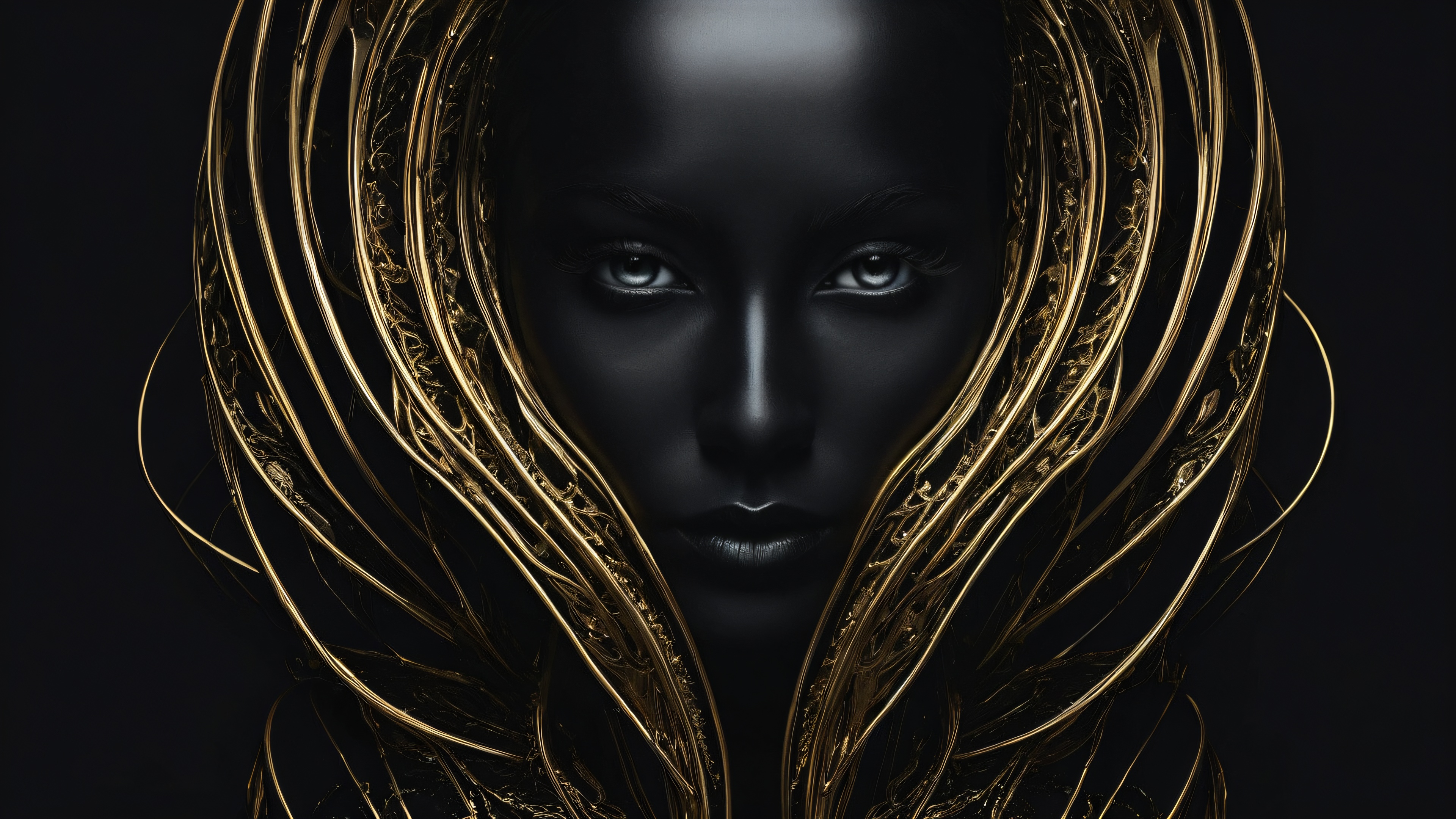 A breathtaking desktop wallpaper of Portrait, Perfectly clean vast pure void, extreme depth of field, deep shadows, Award-winning digital art, pristine clarity, surreal elegance, SLEEK DARK MODE AESTHETIC. Deep perfect blacks, striking crisp contrast, and elegant luminescent accents, {‘palette’: [‘Obsidian’, ‘Gold’], ‘mood’: ‘Ethereal’}, 16:9 aspect ratio, elegant low-key lighting, deep perfect blacks, striking contrast, sleek dark mode aesthetic, luminescent accents, deep rich colors, award-winning digital art, epic breathtaking scale, stunning visual impact, perfect composition, highly textured surfaces, intricate micro-details, physically based rendering, macOS wallpaper aesthetic, masterpiece, highest quality, highly detailed, 8k resolution.