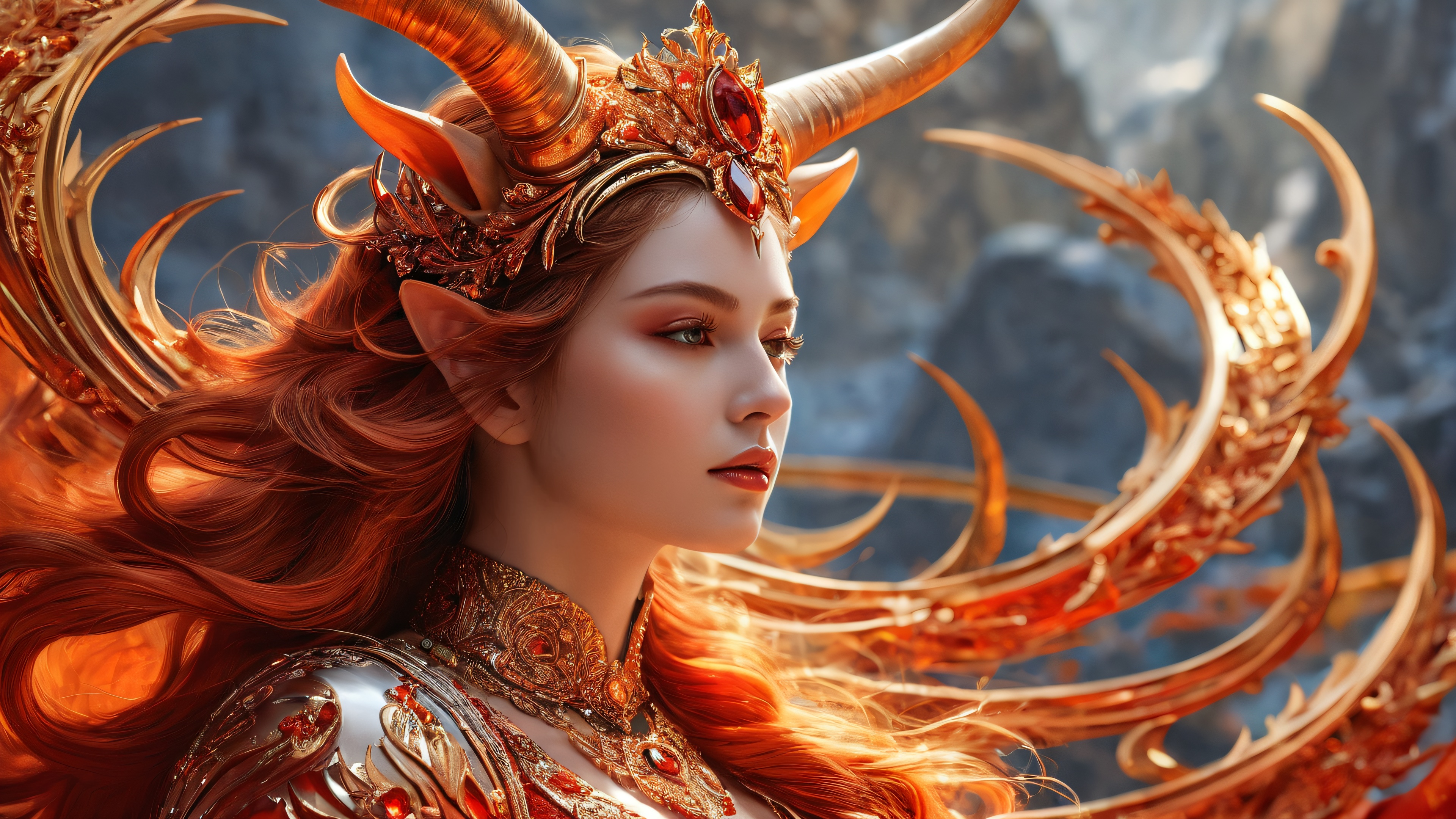 A breathtaking desktop wallpaper of Horned Queen, perfectly clean vast pure void, extreme depth of field, award-winning digital art, pristine clarity, ETHEREAL LIGHTING. Radiant, brilliant colors, ray traced reflections, and pristine clarity. Bright and airy., Deep Reds and Oranges, 16:9 aspect ratio, ethereal lighting, radiant, brilliant colors, ray traced reflections, pristine clarity, award-winning digital art, epic breathtaking scale, stunning visual impact, perfect composition, highly textured surfaces, intricate micro-details, physically based rendering, macOS wallpaper aesthetic, masterpiece, highest quality, highly detailed, 8k resolution.