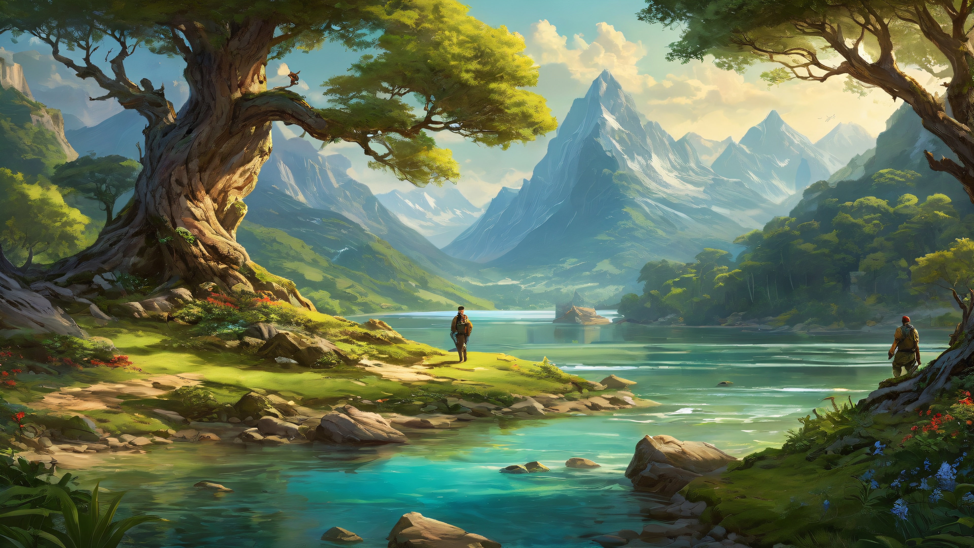 A breathtaking desktop wallpaper of Men Outdoors, Perfectly clean vast pure void with extreme depth of field, allowing for a sense of scale and grandeur., Award-winning digital art, pristine clarity, with a focus on detailed character designs and richly textured environments., Ethereal lighting with radiant, brilliant colors, ray-traced reflections, and pristine clarity. Bright and airy, with an emphasis on highlighting the beauty of the scene., A palette of earthy tones with rich greens and blues, reminiscent of a fantasy world’s natural landscape., 16:9 aspect ratio, ethereal lighting, radiant, brilliant colors, ray traced reflections, pristine clarity, award-winning digital art, epic breathtaking scale, stunning visual impact, perfect composition, highly textured surfaces, intricate micro-details, physically based rendering, macOS wallpaper aesthetic, masterpiece, highest quality, highly detailed, 8k resolution.
