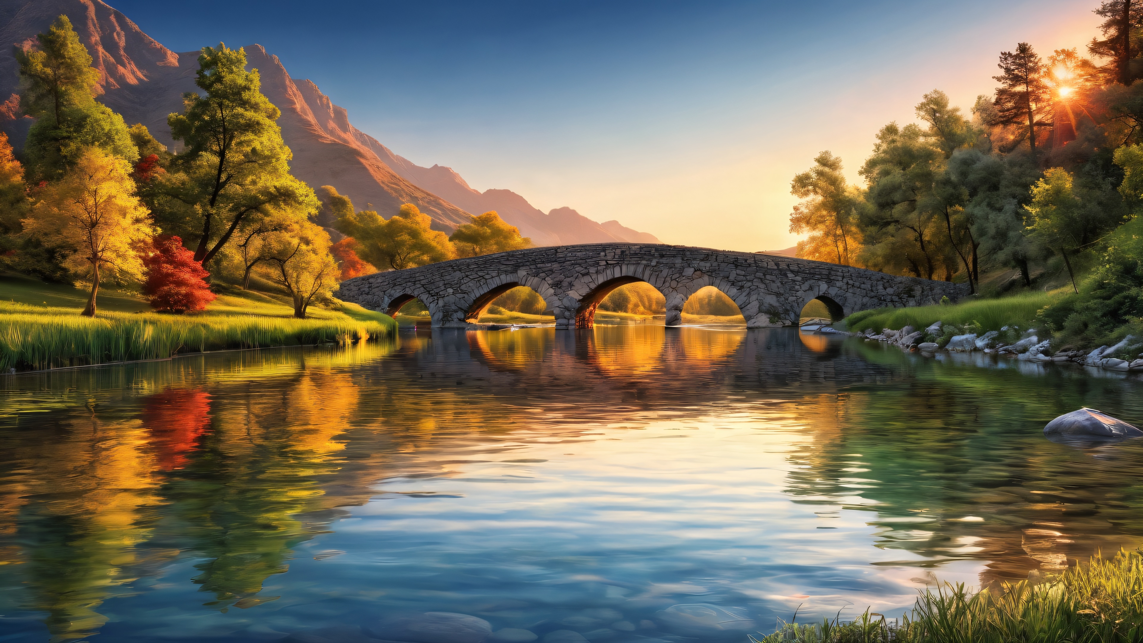 A majestic river scene unfolds on this stunning wallpaper, featuring a perfectly clean and vast pure void. The extreme depth of field creates a sense of serenity, as the river’s gentle ripples reflect off a subtle bridge, while the radiant brilliance of the sunrise casts an ethereal glow. Every detail is meticulously rendered in pristine clarity, inviting you to step into this breathtaking landscape.